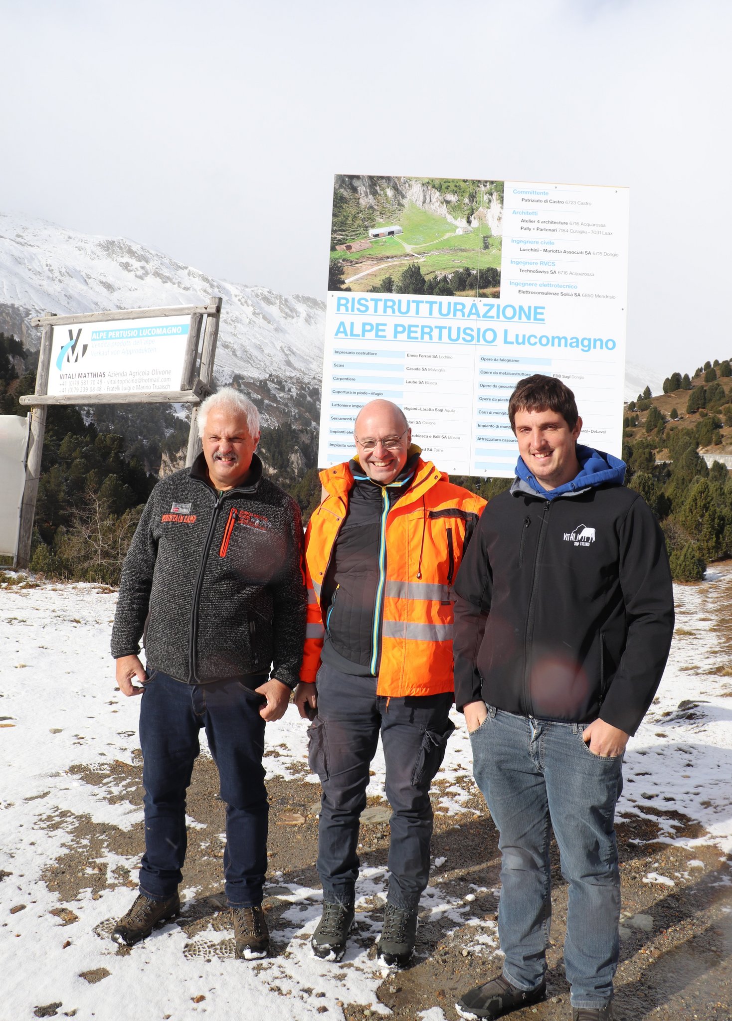 Ich treffe mich in Olivone (TI) in einem Café, das direkt an der Strasse zum Lukmanierpass liegt, mit Matthias Vitali und seinem Vater Doriano. Giorgio Bassi vom Tessiner Landwirtschaftsamt mit Sitz in Bellinzona begleitet uns. Wir wollen uns zur Alpe Pertusio aufmachen. Die Alp ist ein Projekt, das von Bund und Kanton im Rahmen der Strukturverbesserungsmassnahmen (siehe Textbox) finanziell unterstützt wird. Der Kostenumfang beträgt über 3 Mio. CHF, eine stattliche Summe.