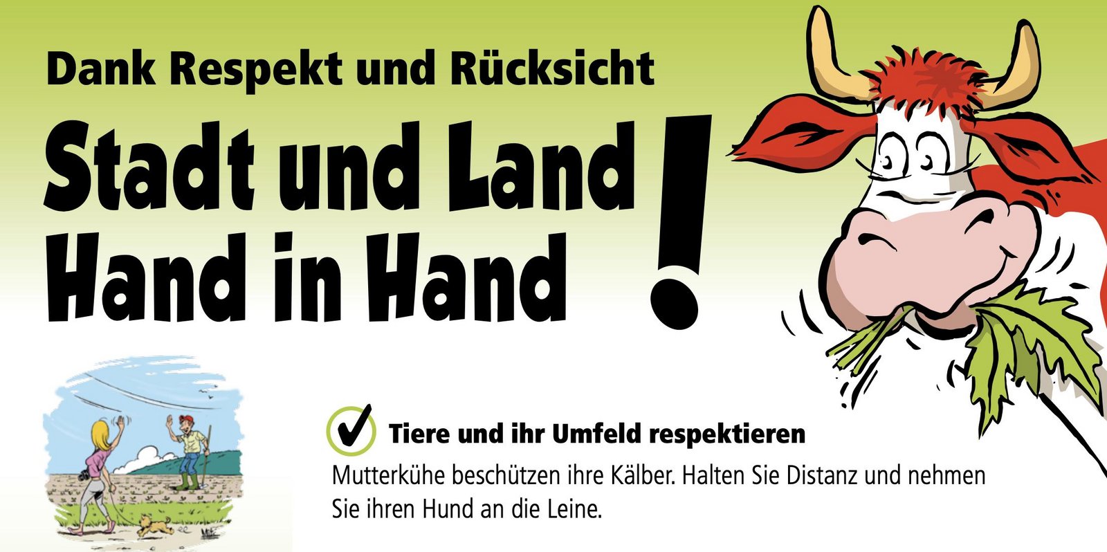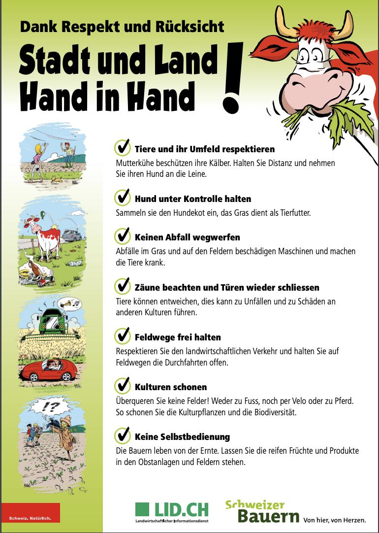 Tiere und ihr Umfeld respektieren: Mutterkühe beschützen ihre Kälber. Halten Sie Distanz und nehmen Sie ihren Hund an die Leine Hund unter Kontrolle halten: Sammeln sie den Hundekot ein, das Gras dient als Tierfutter Keinen Abfall wegwerfen: Abfälle im Gras und auf den Feldern beschädigen Maschinen und machen die Tiere krank Zäune beachten und Türen wieder schliessen: Tiere können entweichen, dies kann zu Unfällen und zu Schäden an anderen Kulturen führen Feldwege frei halten: Respektieren Sie den landwirtschaftlichen Verkehr und halten Sie auf Feldwegen die Durchfahrten offen Kulturen schonen: Überqueren Sie keine Felder! Weder zu Fuss, noch per Velo oder zu Pferd. So schonen Sie die Kulturpflanzen und die Biodiversität Keine Selbstbedienung: Die Bauern leben von der Ernte. Lassen Sie die reifen Früchte und Produkte in den Obstanlagen und Feldern stehen |