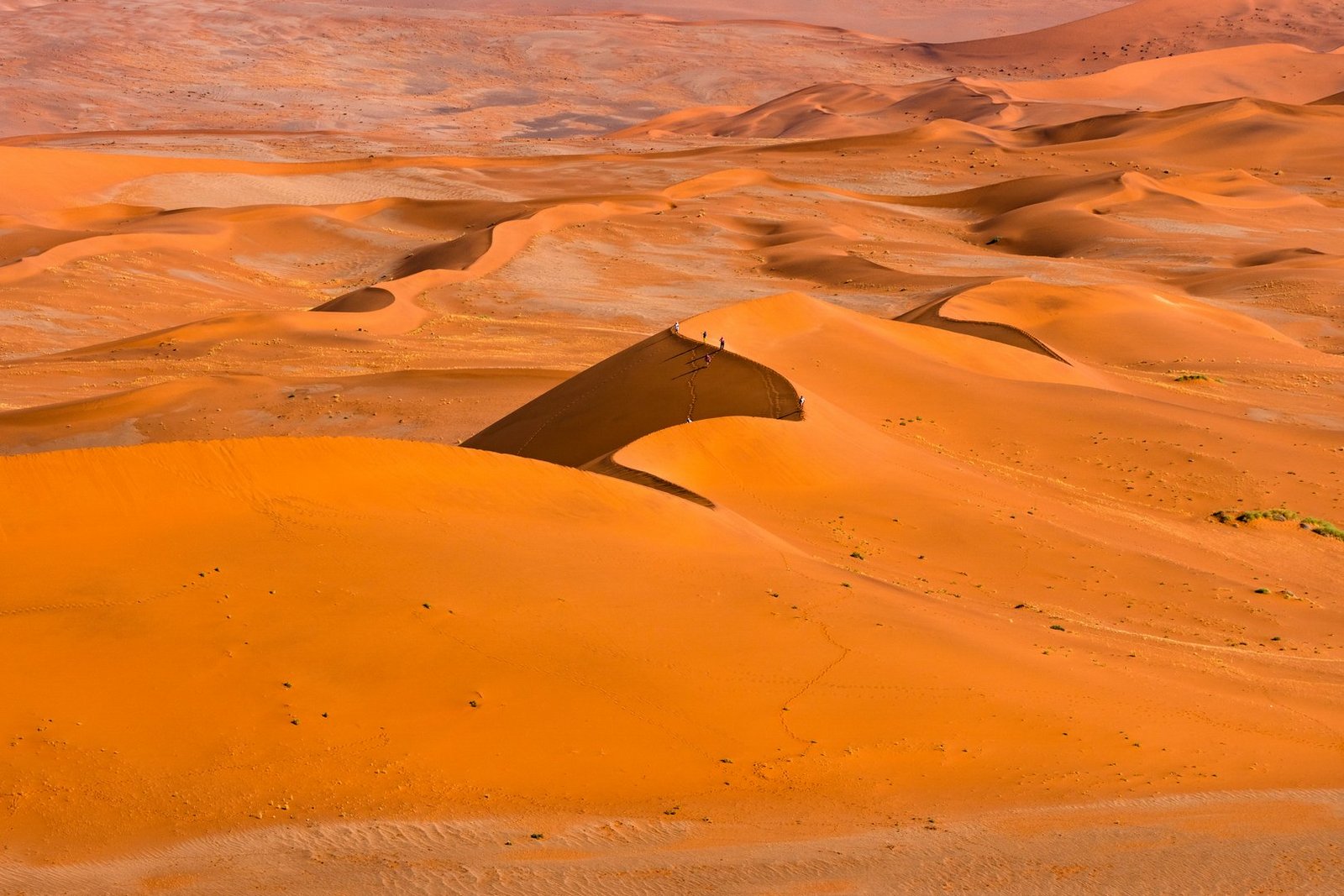 Frühmorgens starten Sie den Ausflug zum Sossusvlei. Die riesigen, ockerfarbenen Dünen des Sossusvlei bieten ein unvergessliches Panorama - bis zu 320 Meter hoch schweben sie zeitlos im Herzen der ältesten Wüste der Welt. Die weissen Vleis bilden einen scharfen Kontrast zu dem roten Sand und dem endlos blauen Himmel. Tiere und Pflanzen, die auf die nächtlichen Wüstennebel angewiesen sind, finden im Sand und unter den verwitterten Kameldornbäumen Zuflucht vor der schwellenden Mittagshitze. Der Tsauchab Fluss reicht tief in den 70 Kilometer breiten Dünengürtel der Namib bis nach Sossus hinein und hat sich dort nach besonders reichen Regenfällen ein Sammelbecken geschaffen - das Vlei (daher der Name Sossusvlei) - in dem das Wasser verdunstet und versickert.