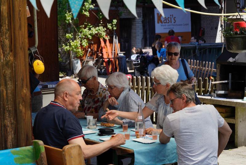 Der werdende Biohofladen mit seinem einladenden Vorplatz und Köstlichkeiten von Regiofair hat zum Verweilen eingeladen. Der Spielplatz mit Trampolin und Sandhaufen im ehemaligen Biotop wird rege benutzt. Im Kaffeestübli bedienen Manuela und Denise die Gäste mit Kuchen und Kaffee. Der Jüngste sorgt für Übersicht beim Parkieren bei der Moser Metzgerei und im Hettligen.