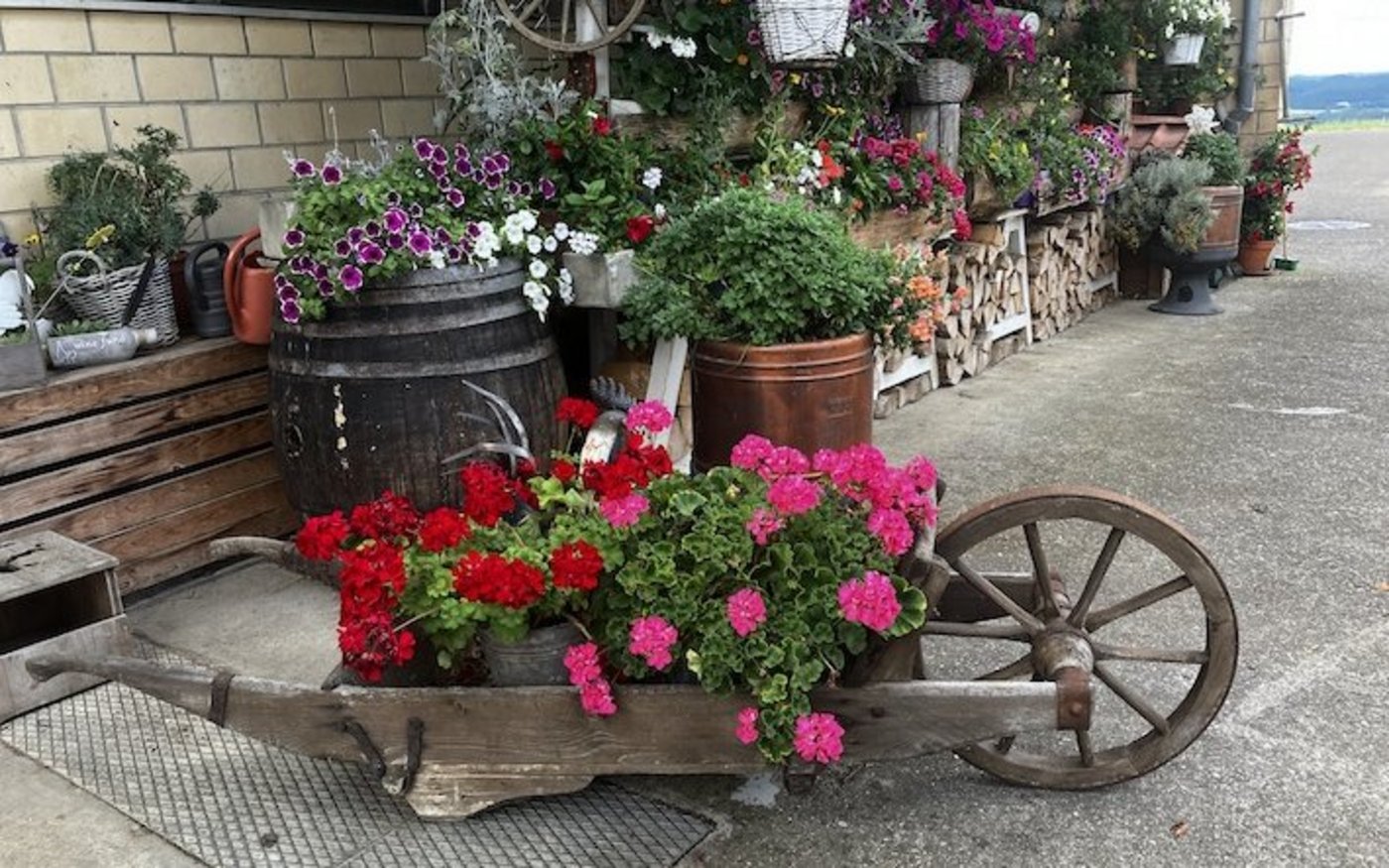 Hier fühlen sich Blumen zu Hause: Wohin man auch schaut, auf dem Zelglihof im thurgauischen Ermatingen blüht es in allen Farbtönen. Rote Rosen und Geranien, Hortensien in Pink, blaue Glockenblumen, orange Kapuzinerkresse und bald auch gelbe Sonnenblumen. All dies ist nicht etwa in einem eigentlichen Bauerngarten zu bewundern, wie man es erwarten könnte. Vielmehr wachsen die Blumen in Grüppchen überall da, wo es Platz…