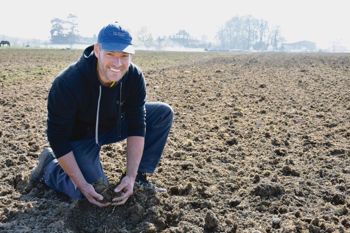 Trockene Erde wird aufgewirbelt, als die Bodenfräse Anfang April über Stefan Krähenbühls Acker fährt. "Seit Wochen hat es hier nicht mehr geregnet, aber unterhalb der Grasnarbe ist der Boden feucht", sagt der Landwirt und sticht den Spaten in den Boden. Er hebt ein Stück des Schwemmlandbodens aus und zerreibt ihn mit den Fingern. Er ist bröselig und feucht. Regenwürmer zeigen sich. Krähenbühl bearbeitet seinen Boden…