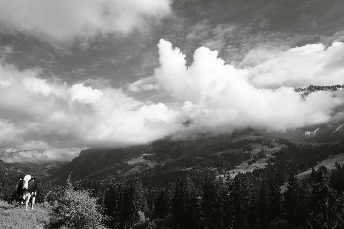 Gegenüber, halb durch Wolken verdeckt, stand der Hohgant, hinter uns die Schrattenfluh und dazwischen das Brienzer Rothorn und das Tannhorn. Und hier, an den Hängen rund um Trittschwendi, war sie inmitten ihrer Freunde. Einige Kurven weiter unten sonnte sich der Collie Luna zusammen mit der Grossmutter. Weiter oben war Bläss Kira mit seinem Besitzer Kidlä, auf der anderen Seite sprach Sämis Grosi im Garten mit einem blind geborenen Kätzchen. Was die Kuh 9051 betrifft, so war sie in keiner Eile irgendwohin zu gehen. Sie wusste, was die meisten Schangnauer wissen: das ist kein schlechter Platz für einen kleinen Zwischenhalt.