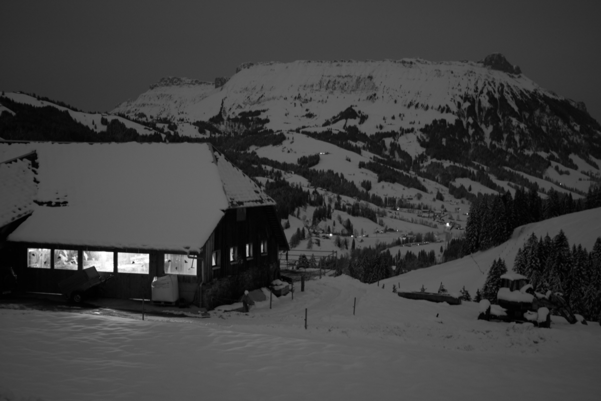 Die Zeit scheint an mir vorbeigeeilt zu sein, hinunter in die Schlucht des gefrorenen Schwarzbachs. Ich bin zu spät dran. Zu spät für das Licht, zu spät in der Kälte, für das einsame Auto, das mich nicht sieht, als ich über die zu schmale Strasse knirsche, graue Schritte auf grauem Eis. Und da, eingehüllt in Schnee und Halbdunkel: die Schrattenfluh. Der Berg, der die Spuren eines eifersüchtigen Geistes trägt, der ihn im Kampf um eine Frau gekrallt hat. Sie mögen lachen, aber mein Freund Wernu hat auch so etwas gesehen. Er war auf seiner Alp auf dem Schönbühl und hat den Teufel auf dem Berg gesehen.