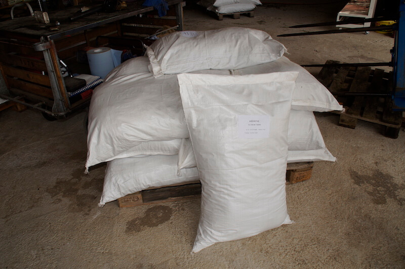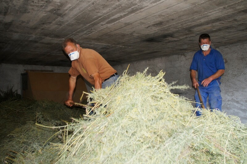 Nach der Ernte wird der Wermut mit dem Ladewagen zur Trocknungsanlage gefahren, die ein paar Höfe entfernt liegt. Für 3-4 Tage kommt das Kraut zum Trocknen in den Entfeuchter, damit es danach gut gehäckselt werden kann. Das Häckseln ist wichtig, um die holzigen Stängel von den feinen Blüten und Blättern zu trennen. Denn nur die Blüten und Blätter werden für die Destillation gebraucht.