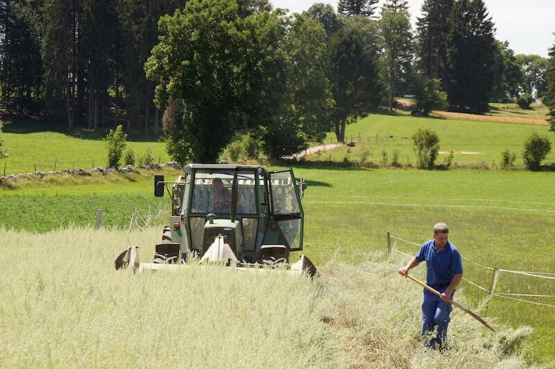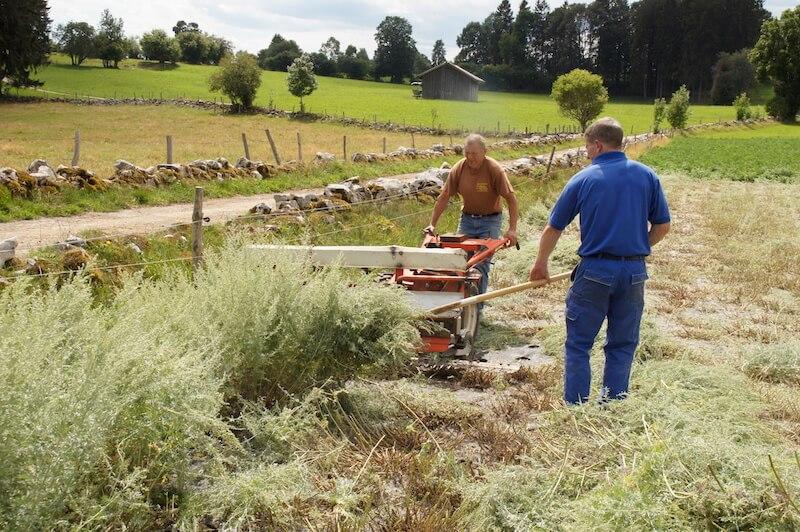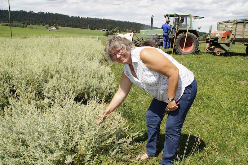 Das meiste kann mit dem Frontmäher und Ladewagen gemäht werden, doch manche Felder und Ecken sind so schmal, dass dafür der Motormäher eingesetzt werden muss. Während ihr Mann Heinz mit dem Frontmäher über das Feld fährt, schneidet Marlise am Rand die restlichen Stängel von Hand. Nach der Ernte werden die Wermutstauden runter geschnitten. Dieser Säuberungsschnitt erleichtert das Jäten im nächsten Frühling.