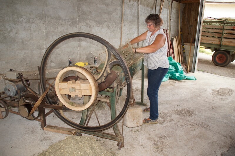 Die Häckselanlage mutet rustikal an. Doch für die 600-800 Kilogramm Wermut pro Jahr reicht es völlig. Besonders während des Häckselns breitet sich ein bitterer Geschmack in der Luft aus, der auf den Lippen hängen bleibt. Doch Absinth beziehungsweise Wermut sei gut für den Magen und die Verdauung, weiss Marlise Baur.