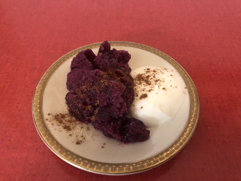 Farblich sorgt das tiefdunkle Violett sicher für einen Hingucker auf dem Dessert-Teller. Geschmacklich ist das Kohl-Sorbet mit seiner süsslich-fruchtigen Kohlnote eher etwas ungewöhnlich.