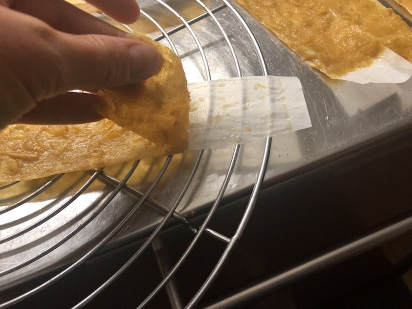 5. Im Backofen mit Umluft bei 70°C während 3 –4 Stunden trocknen. Das Fruchtleder muss sich am Ende gut vom Backpapier lösen.