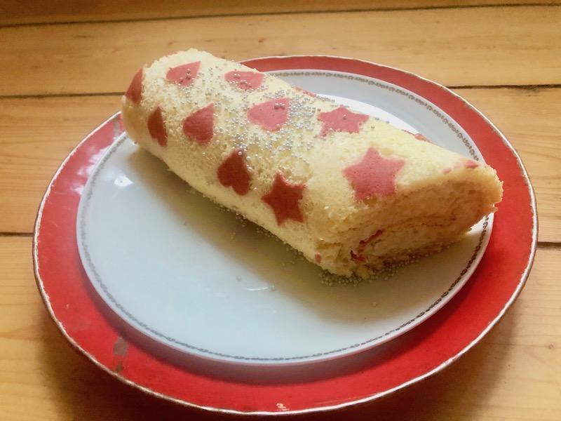- Das Biskuit mit der Füllung nicht ganz bis zu den Rändern bestreichen, satt aufrollen. Bis zum Servieren kühl stellen.