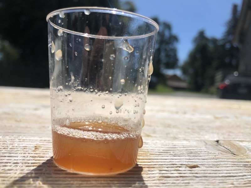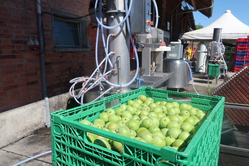 - Zum Speck und der Zwiebel die Apfelstücke beigeben und mit Verjus ablöschen und kurz köcheln.