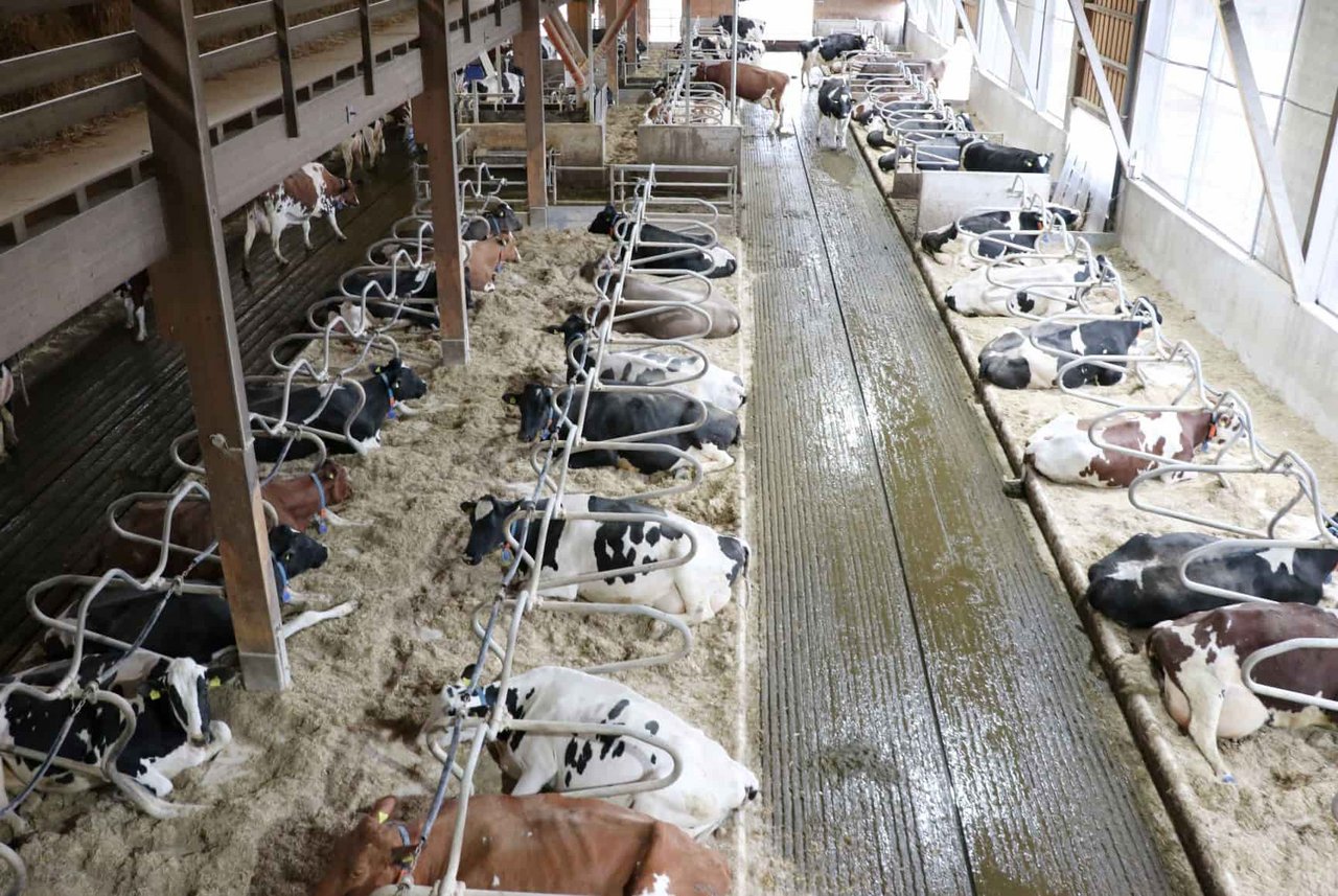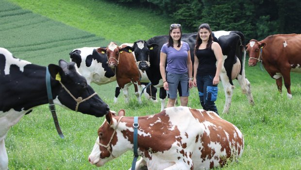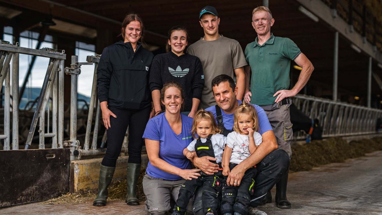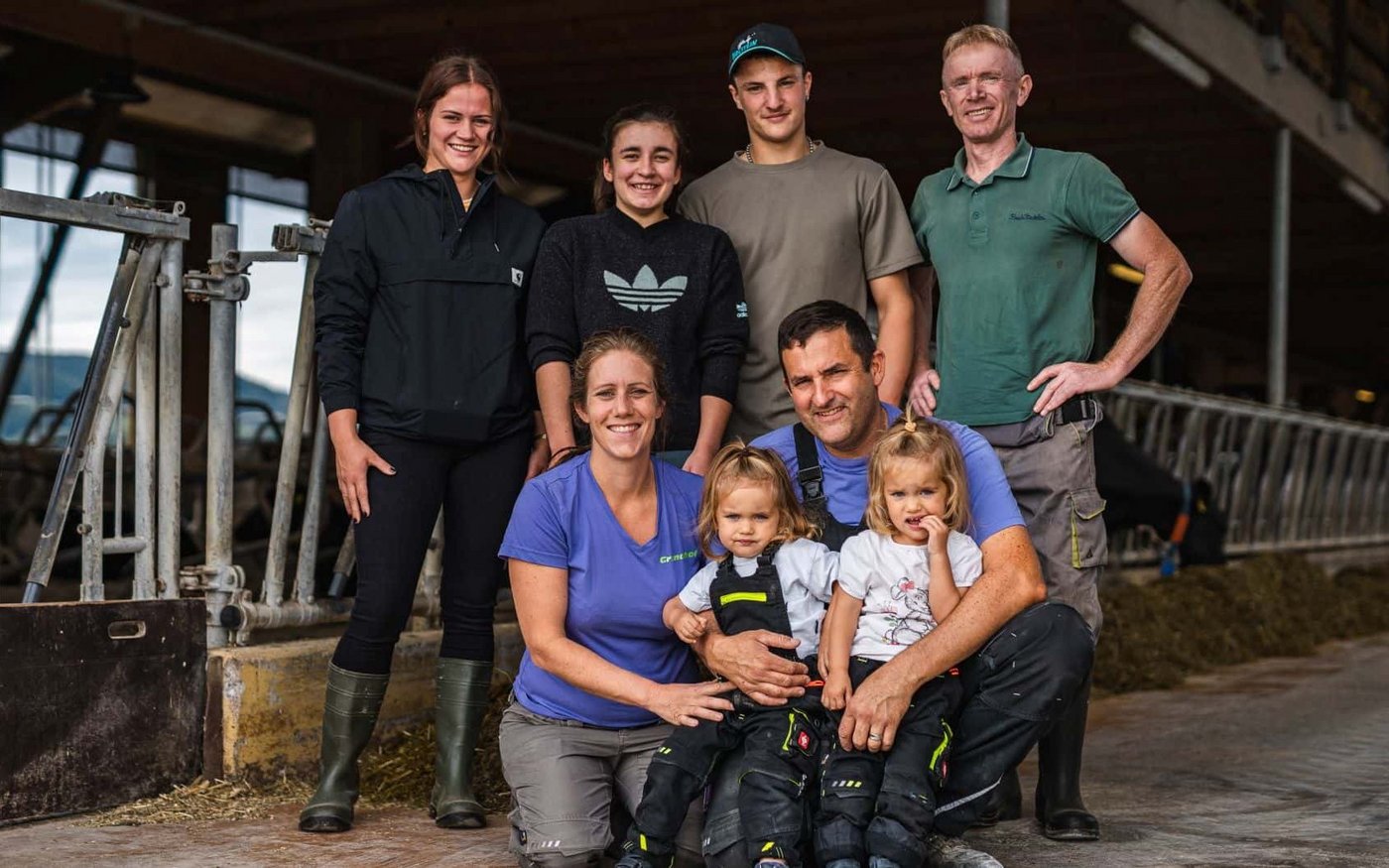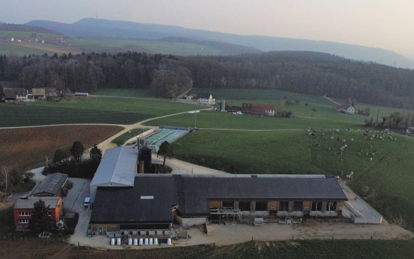 Mit ihrem Mann spricht Sabrina Schlegel französisch, mit dem Mitarbeiter Italienisch, mit den Kühen Schweizerdeutsch. Sie geht durch den Stall und klärt gleich noch einige Fragen, während des Fotoshootings harkt sie nebenbei ein paar Liegeflächen. Herumstehen hat sie nicht auf dem Programm. Aber dann führt sie zwei Treppen hoch in das Stallbüro – der Ausblick auf130 Milchkühe ist fantastisch – und zeigt: Genau…