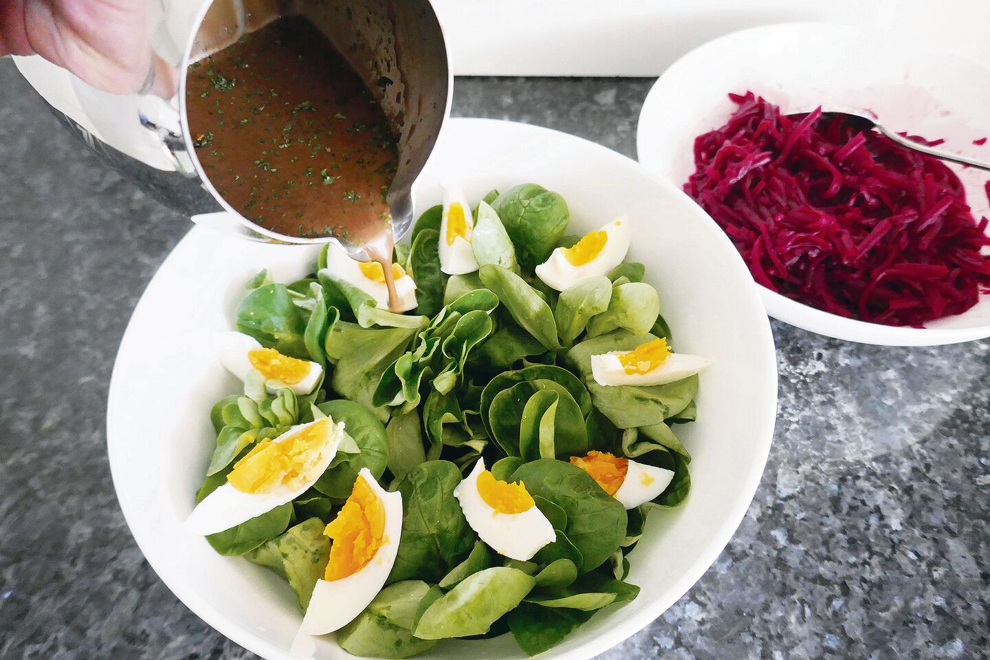 Manchmal muss es einfach schnell gehen, gerade am Mittag in der Küche. Ein Salat wäre dann ideal. Doch eben, es fehlt Zeit und Musse für die Zubereitung eines feinen Dressings mit ausgewählten Zutaten. Und ohne Salatsauce findet das «Grünzeug» kaum Anklang. Die gute Nachricht: Salatsauce lässt sich gut auf Vorrat zubereiten und im Kühlschrank lagern. So ist im Nu eine Vorspeise aus saisonalem Gemüse und/oder…