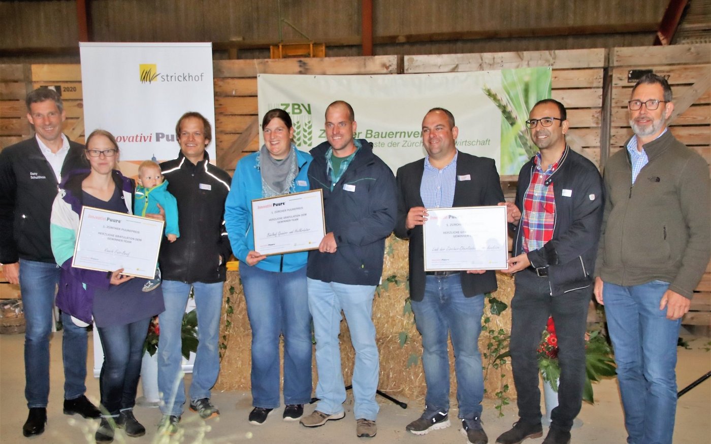 Am frühen Nachmittag, nachdem leichter Regen eingesetzt hatte, wurde der kleine Festakt im Stall Höfli der Familie Weidmann durchgeführt. Erstmals wurde der mit je 5000 Franken dotierte Zürcher Puurepreis an drei innovative Betriebe verliehen. Im Kanton Zürich wird mit dem Projekt «Innovativi Puure» seit einigen Jahren die Innovation in der Landwirtschaft gezielt gefördert und jetzt auch ausgezeichnet. Sechs Projektteams schafften es ins grosse Finale am Sonntag. Die Auswahl wurde von einer breit abgestützten sechsköpfigen Fachjury vorgenommen.