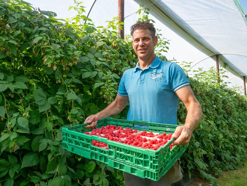 Die Himbeeren-Anbauflächen in der Schweiz sind seit Jahren stabil. Nur im Bio-Segment findet auf tiefem Niveau ein höheres Wachstum statt. Total wuchsen im letzten Jahr in der Schweiz auf rund 170 Hektaren Himbeeren. In diesem Jahr rechnet der Schweizer Obstverband mit einer Ernte von 2070 Tonnen. Die Menge deckt allerdings nicht einmal ein Drittel der Inlandnachfrage ab. Da wäre eigentlich noch Luft nach oben für Schweizer Beerenproduzenten. Doch Spezialkulturen wie Himbeeren sind anspruchsvoll im Anbau, erfordern hohe Investitionen und sind im Hochlohnland Schweiz ein Risikogeschäft, in das man nicht einfach so von heute auf morgen einsteigt.