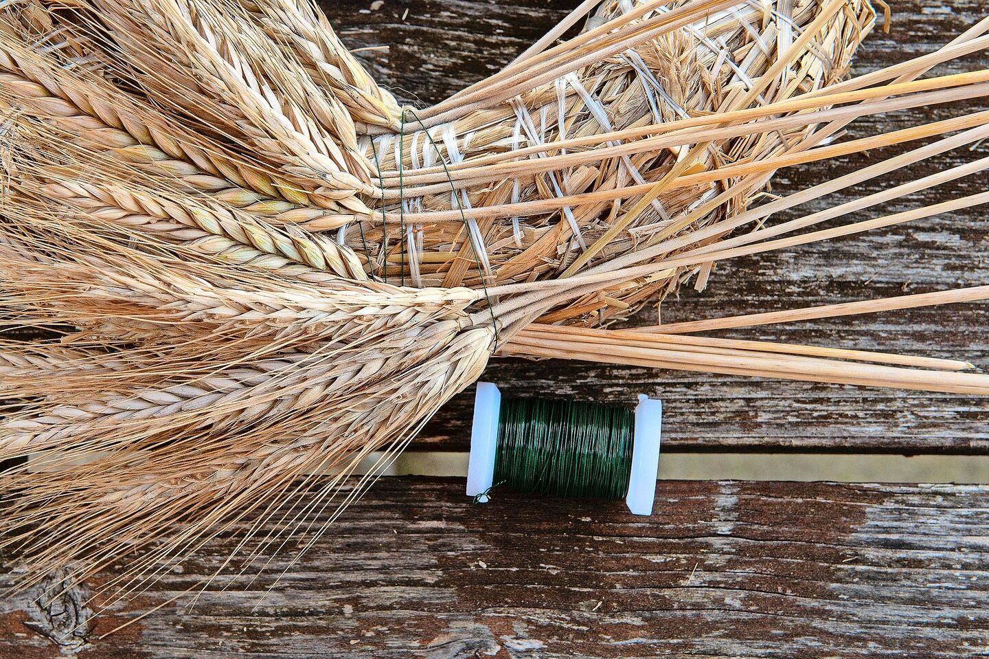 Um den Kranz zu binden, braucht es genügend Zeit und etwas Geduld. Zudem empfiehlt es sich, diesen an einem Ort zu binden, wo die Reinigung einfach ist. Denn bei der Arbeit brechen Grannen ab und diese haften überall. Eine Möglichkeit ist zum Beispiel, den Kranz auf der Terrasse draussen zu fertigen, wo der Boden mit Besen gewischt und anschliessend mit dem Gartenschlauch abgespritzt werden kann.