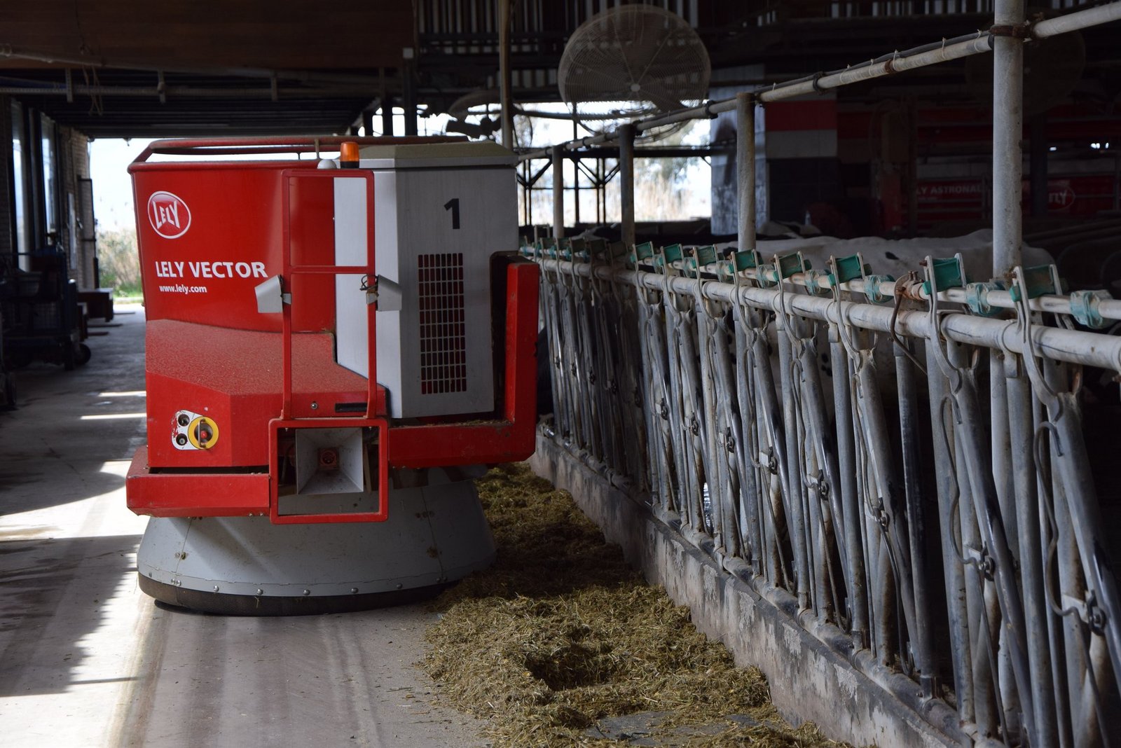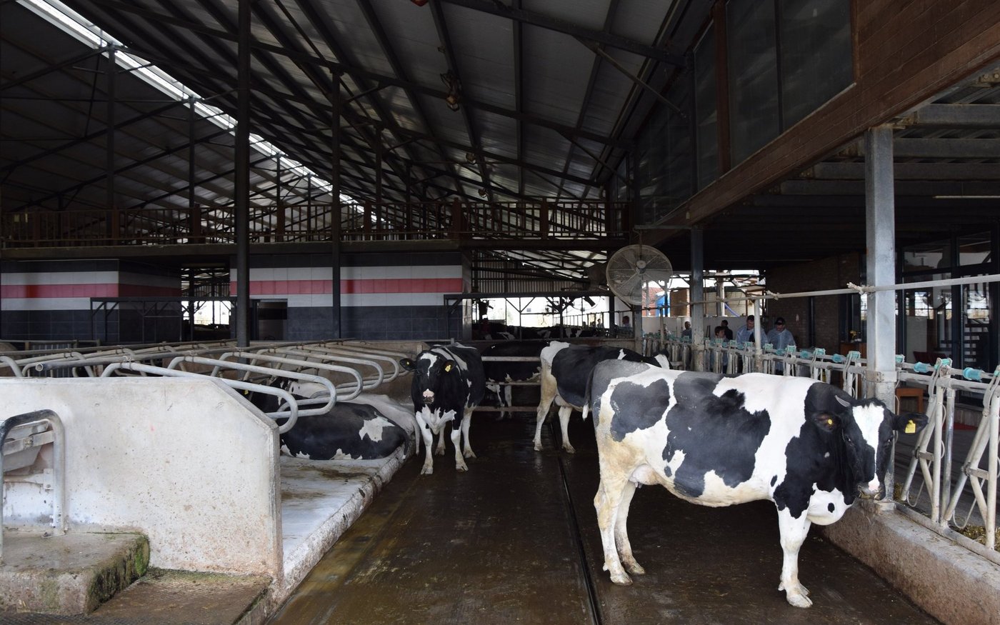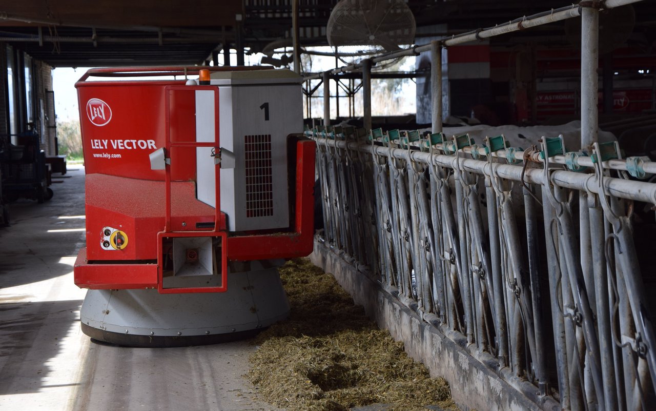 Die Milchkühe bekommen frisches Futter – von Vertragsbauern, die Gülle als Tausch erhalten –, das vollautomatisch gemischt und dem gemessenen individuellen Bedarf entsprechend, ebenfalls mit Robotik, verteilt wird. Die Kühe gehen freiwillig zum Melken (drei Melkroboter), was rund um die Uhr möglich ist und je nach Tier bis zu 4- bis 5-mal pro Tag stattfindet – 60 l/Kuh und Tag.