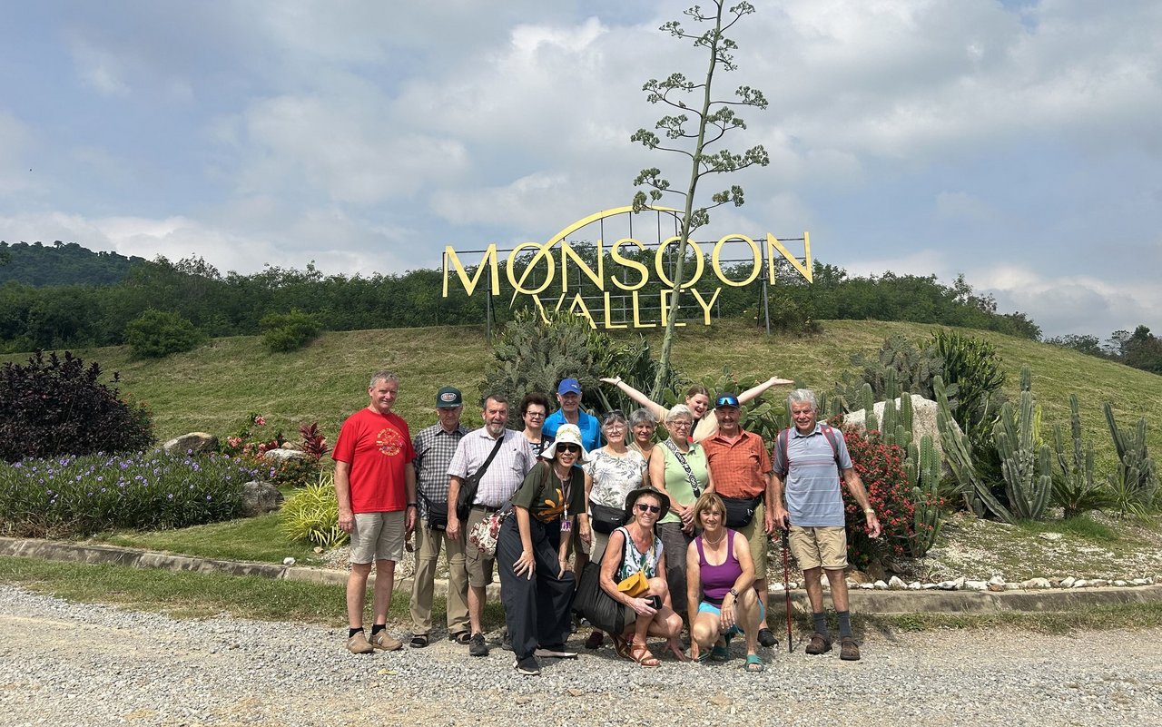 Auf unserem letzten Ausflug, nicht weit von Hua Hin, besuchen wir ein Weingebiet, das Elefantenfütterung als Attraktion für Touristen anbietet. Während der Führung, bei der wir mit einem Golfmobil durch das Gebiet fahren, bekommen wir die Gelegenheit, die Reben aus der Nähe anzuschauen. [IMG 21]