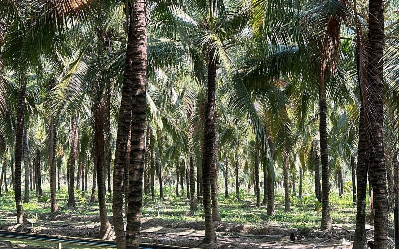Etwa 100 Kilometer entfernt von Bangkok besuchen wir eine Kokosnussfarm. Durch die dichten Palmenblätter scheint die starke Mittagssonne. Vor der Besichtigungstour offeriert uns das Team Kokosnussmilch direkt aus einer frischen Frucht. Die Palmen stehen kilometerweit aneinandergereiht nebeneinander, zwischen jeder Reihe zieht sich ein Wassergraben durch das Gebiet.