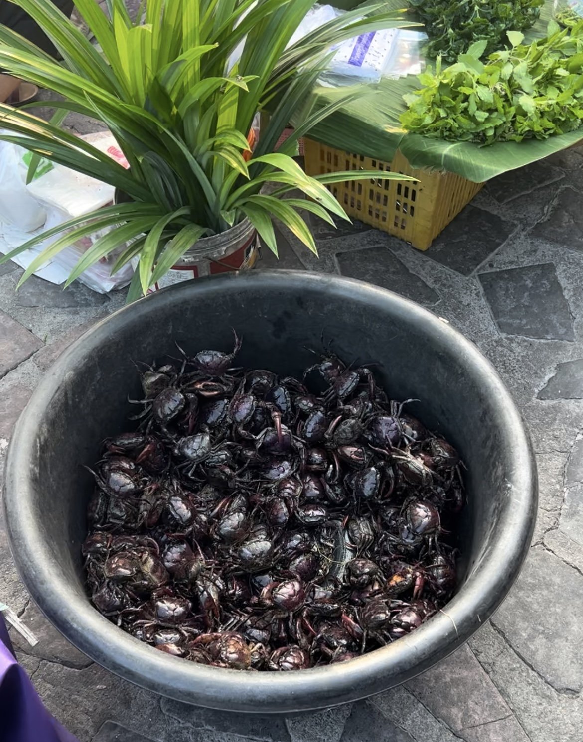 Für den Besuch auf dem Markt in Uthai Thani, den wir frühmorgens besuchen, instruiert die thailändische Reiseleiterin und bereits vorher, dass wir einen Geruch wahrnehmen oder eine Zubereitungsart sehen werden, die wir uns nicht gewöhnt sind. Wir sollen nicht die Miene verziehen oder die Nase zuhalten, da dies als unfreundlich angesehen wird, sondern einfach weitergehen. Gespannt schlendern wir durch die enge Marktgasse und bewundern auf allen Seiten die Ware, die zum Verkauf angeboten wird.