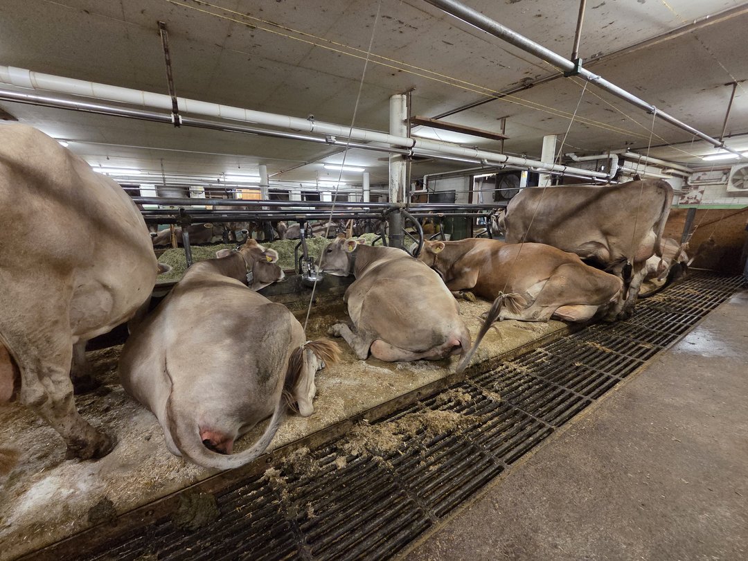 Der Grossteil der Milchkühe und das Galtvieh werden im Anbindestall mit Baujahr 1987 gehalten. Hier hat es 26 Kuhplätze. Weitere 15 Plätze gibt es in einem 2020 realisierten Anbau, einem Laufstall mit Tiefboxen. Der Anbau war zuerst für die Rinder und die Galtkühe gedacht. Dies sei dann aber nicht aufgegangen wegen der Erhöhung der Tierzahlen und weil er mehr melken konnte, und so verteilen sich die Milchkühe heute auf den Anbinde- und den Laufstall.