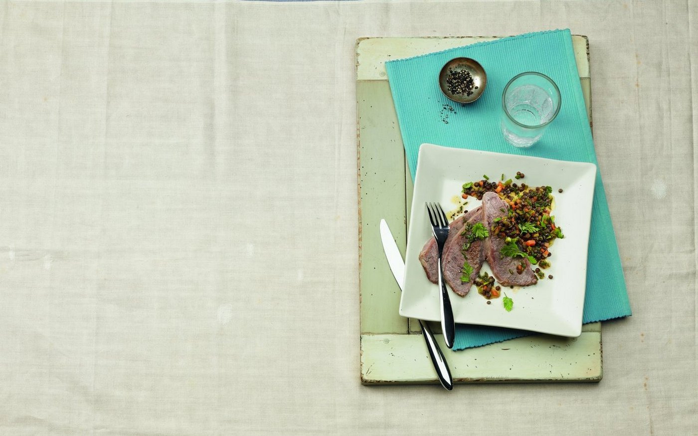 3. Das Siedfleisch in dünne Scheiben schneiden und mit dem Linsengemüse servieren.