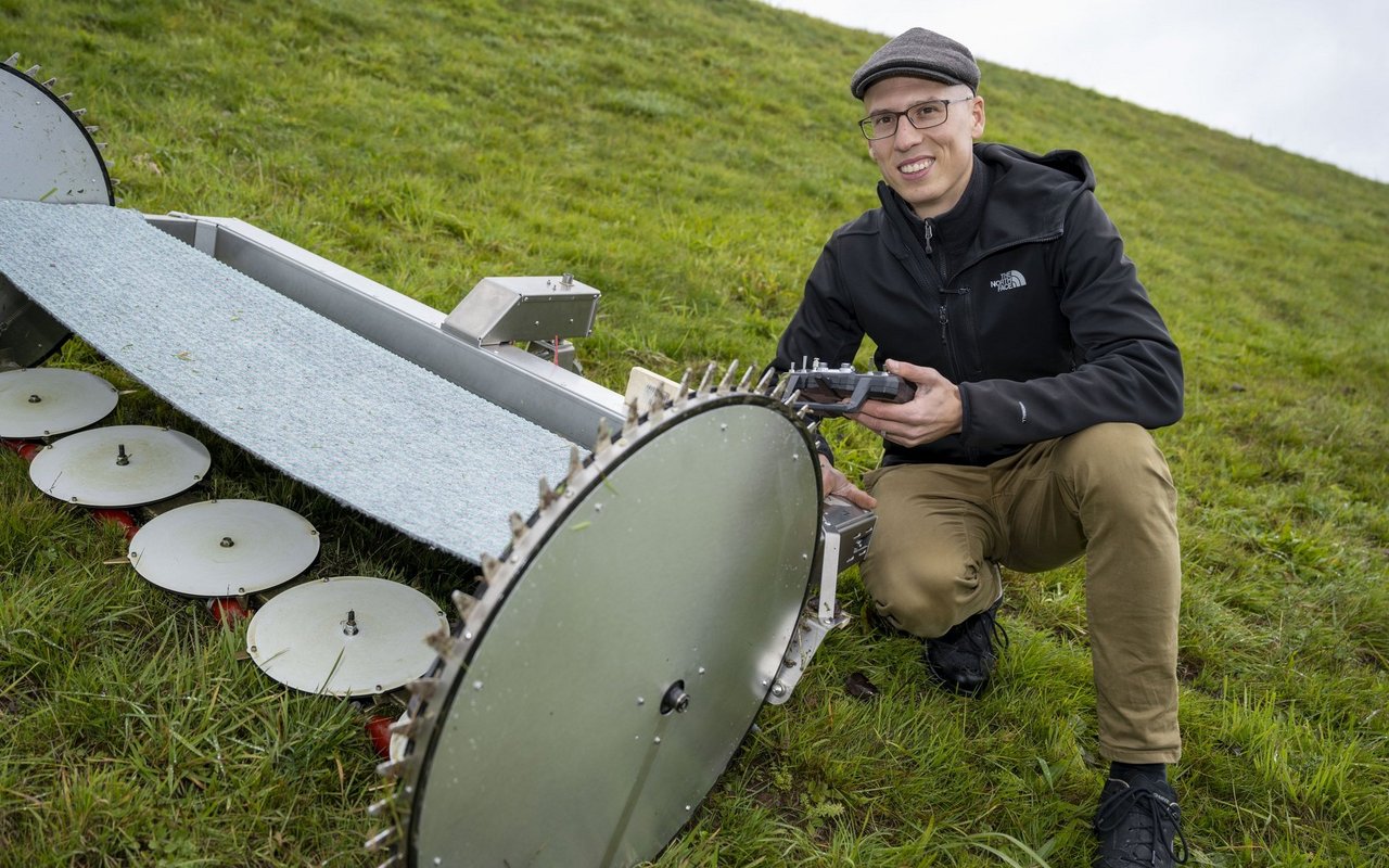 Mit seinem Projekt hat Amadeo Knüsel den «Zinno-Ideenscheck für Berggebiete» gewonnen. Die 15'000 Franken Preisgeld wolle er vollständig in die Weiterentwicklung seines Mähers stecken, schreibt die Schweizer Berghilfe. So soll das Gerät z. B. künftig ohne Fernbedienung autonom am Hang arbeiten können. Dank seinem geringen Gewicht werde es den Boden nicht verdichten und auch – bis auf die gemähte Wiese – keine Spuren hinterlassen. Betrieben wird der Roboter elektrisch.