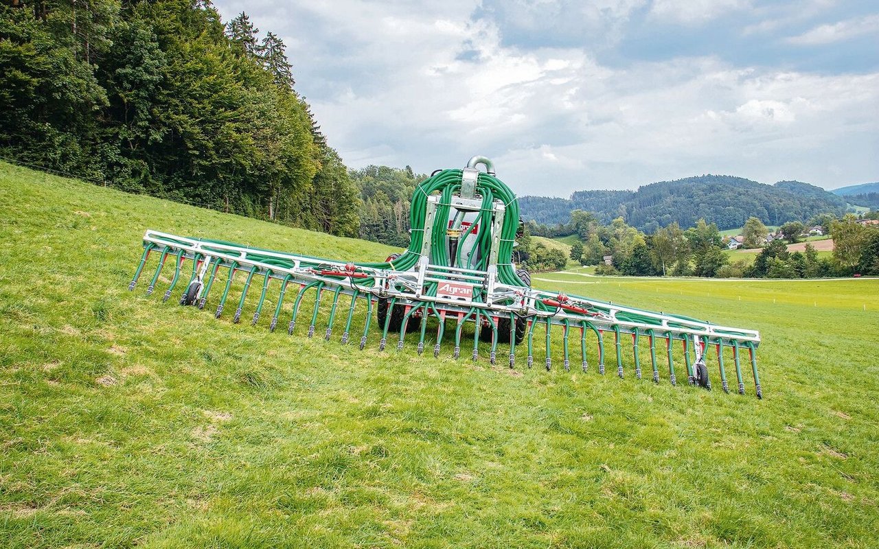 Auch die Schleppschuhe sind für einen Einsatz am Hang konstruiert: Sie bestehen aus Gussschlitzkufen mit Gummidüsen und werden von Federstahlplatten geführt. Durch den verstellbaren hydraulischen Gegendruck werden sie auch bei unebenem Gelände zuverlässig am Boden gehalten. Das Arbeiten am Hang wird zusätzlich dadurch unterstützt, dass sich die Arme des Verteilers individuell bewegen können, denn die Querverteilung findet seitenunabhängig statt. Gehalten werden die Arme durch serienmässig verbaute Stützräder.