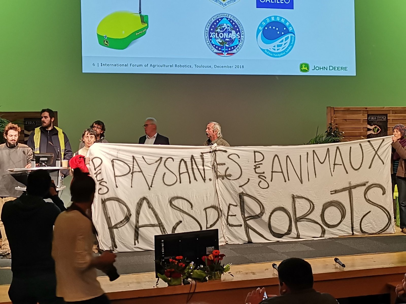 Sie konnten dem perplexen Publikum während einer halbe Stunde ihre Parolen präsentieren. Sie beklagten sich primär über die zunehmende Industrialisierung in der Landwirtschaft, welche die kleinen Bauernhöfe verdränge. Roboter würden den Prozess nur beschleunigen. Das Angebot der Veranstalter, mit einem Vertreter aktiv an der Podiumsdiskussion teilzunehmen, schlug die Gruppe aus. Nach dem unerwarteten Unterbruch wurde die Veranstaltung fortgesetzt.