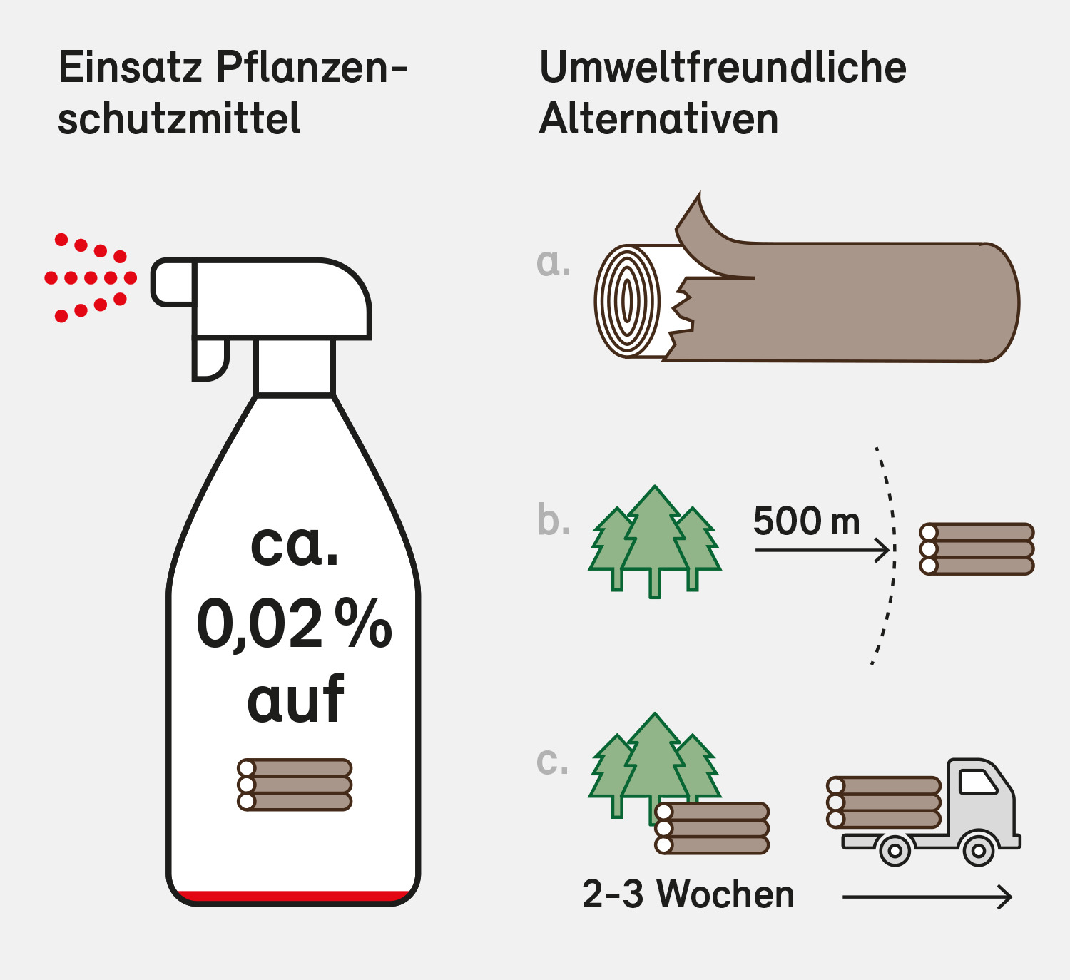 Nur gerade 0,02 Prozent des Gesamtverbrauchs an Pflanzenschutzmitteln kommen in Schweizer Wäldern zum Einsatz. Meist handelt es sich um Cypermethrine, die auch im Weinbau und der Landwirtschaft verwendet werden, aber als stark gewässergefährdend gelten. Im natürlichen Ökosystem Wald können diese Insektizide – trotz Auflagen zur Anwendung – Schaden anrichten. Daher sei eine Reduktion im Sinne der Branche.