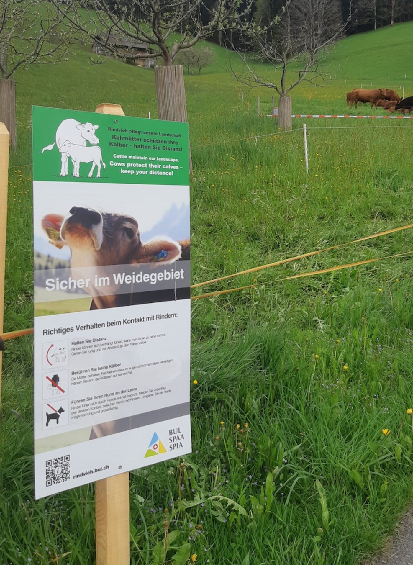 Für jene Betriebe, die Besucherinnen und Besucher auf die drei wichtigsten Verhaltensregeln hinweisen wollen (Distanz halten, keine Kälber anfassen, Vorsicht bei Herdenschutzhunden), hat die BUL eine weitere Tafel entworfen. Diese diene allerdings rein informativen Zwecken und ersetze nicht die grüne Warntafel «Kuhmütter schützen ihre Kälber!».