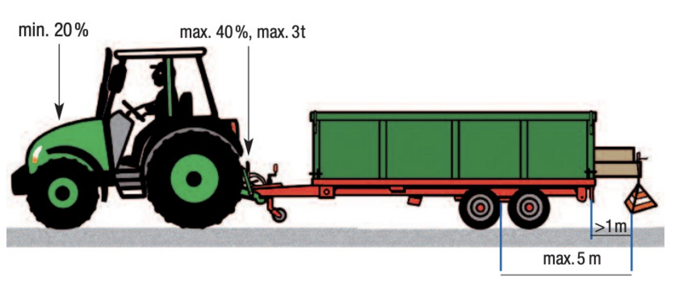 - Auch wenn schwere Anhänger mitgeführt werden, muss die Belastung der Traktoren-Vorderachse mindestens 20 Prozent betragen.