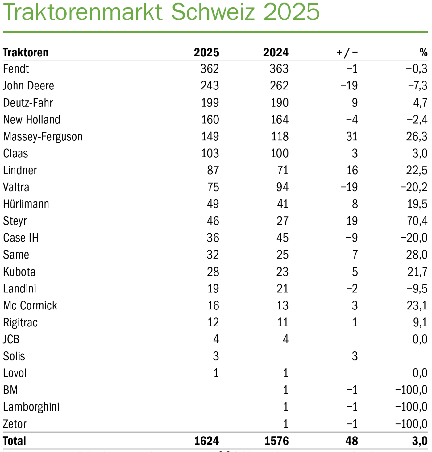 Die Traktoren-Neuzulassungen in der Schweiz sind letztes Jahr gesamthaft leicht angestiegen. Insgesamt wurden 1624 neue Traktoren verkauft. Das sind 48 mehr als noch im Jahr 2024. An das Spitzenjahr 2023 mit insgesamt 1854 Neuzulassungen konnte man indes nicht anknüpfen. Marktführer bleibt weiterhin Fendt mit 362 Neuzulassungen (−1), gefolgt von John Deere mit 243 neu verkauften Traktoren (−19) und Deutz-Fahr mit 199 Neuzulassungen (+9). Fendt realisiert somit einen Marktanteil von 22,3 %, gefolgt von John Deere (15 %) und Deutz-Fahr mit einem Marktanteil von 12,3 %. Auf dem vierten Rang platziert sich erneut New Holland mit 160 Neuzulassungen und einem Marktanteil von 9,9 %.