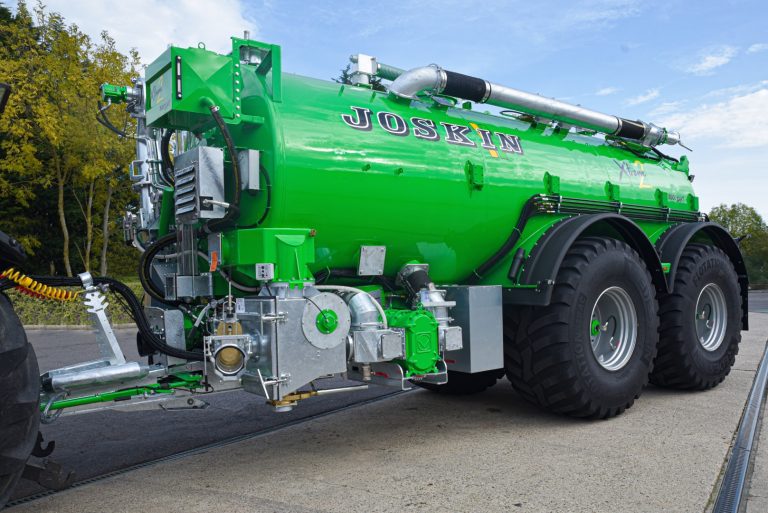 Joskin verpasst seinen Güllefässern mit dem X-trem2 ein Update. Die Verengung auf der Bodenunterseite verjüngt sich auf nur 760 mm auf Höhe der Achse, womit Räder mit 850 mm Breite möglich sind, ohne den Einschlagwinkel der zwangsgelenkten Achse zu begrenzen. Gleichzeitig bleibt die Gesamtbreite unter 3 m. Um die Reifenauswahl noch zu erhöhen, sind zwei Unterbaureihen zu haben. Zur weiteren Ausstattungen gehören Hydro-Tandem-Federung, hydropneumatische Deichselfederung und ein schweres hinteres Hubwerk.