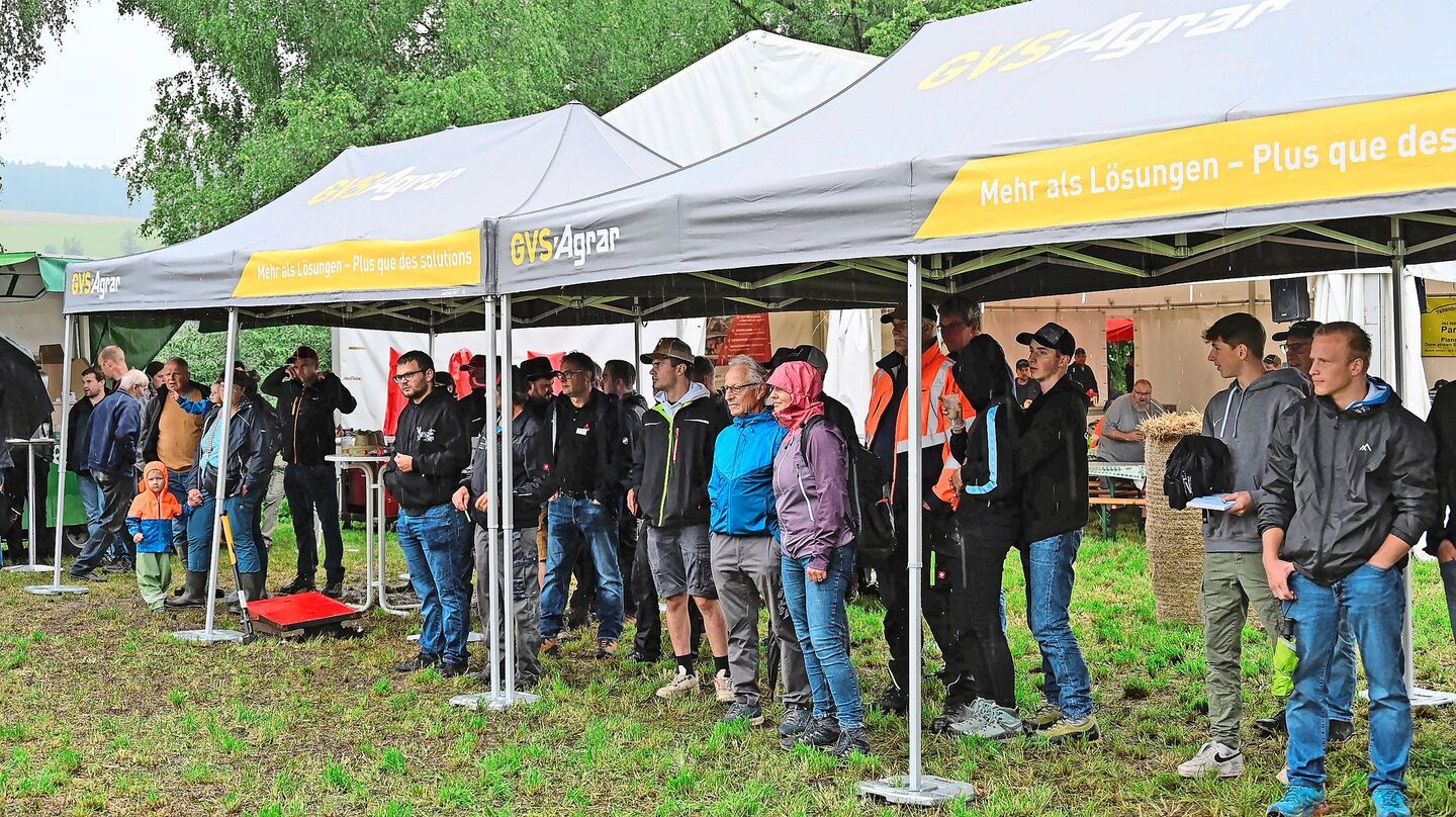 Zwar fiel die geplante Feldvorführung, bei der die Maschinen im Einsatz gezeigt werden sollten, ins Wasser. Doch das tat der guten Stimmung unter der Besucherschar keinen Abbruch – und die Organisatoren machten das Beste aus der Situation. So wurden Traktoren und Maschinen auf dem Feldweg vorgeführt. Die Zuschauer(innen) konnten die Präsentation unter einem Zelt und halbwegs im Trockenen verfolgen.