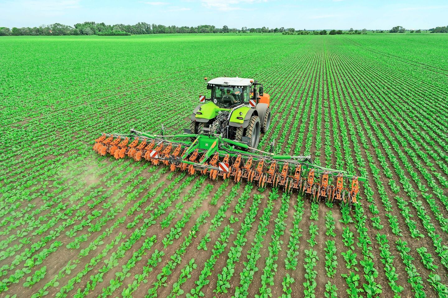 Eine Kombination aus dem Frontbehälter Ftender und einem Verteilerkopf auf der Hackmaschine ermöglicht eine schlagkräftige und effiziente Düngung der Kulturpflanzen. Die Ausbringung erfolgt je nach Bedarf gezielt an der Pflanzenreihe, zwischen den Reihen oder flächig über Prallteller. Zusätzlich eignet sich das System zur Saatgutausbringung, beispielsweise für Untersaaten. Für die Einarbeitung stehen verschiedene nachlaufende Werkzeugkombinationen zur Verfügung.