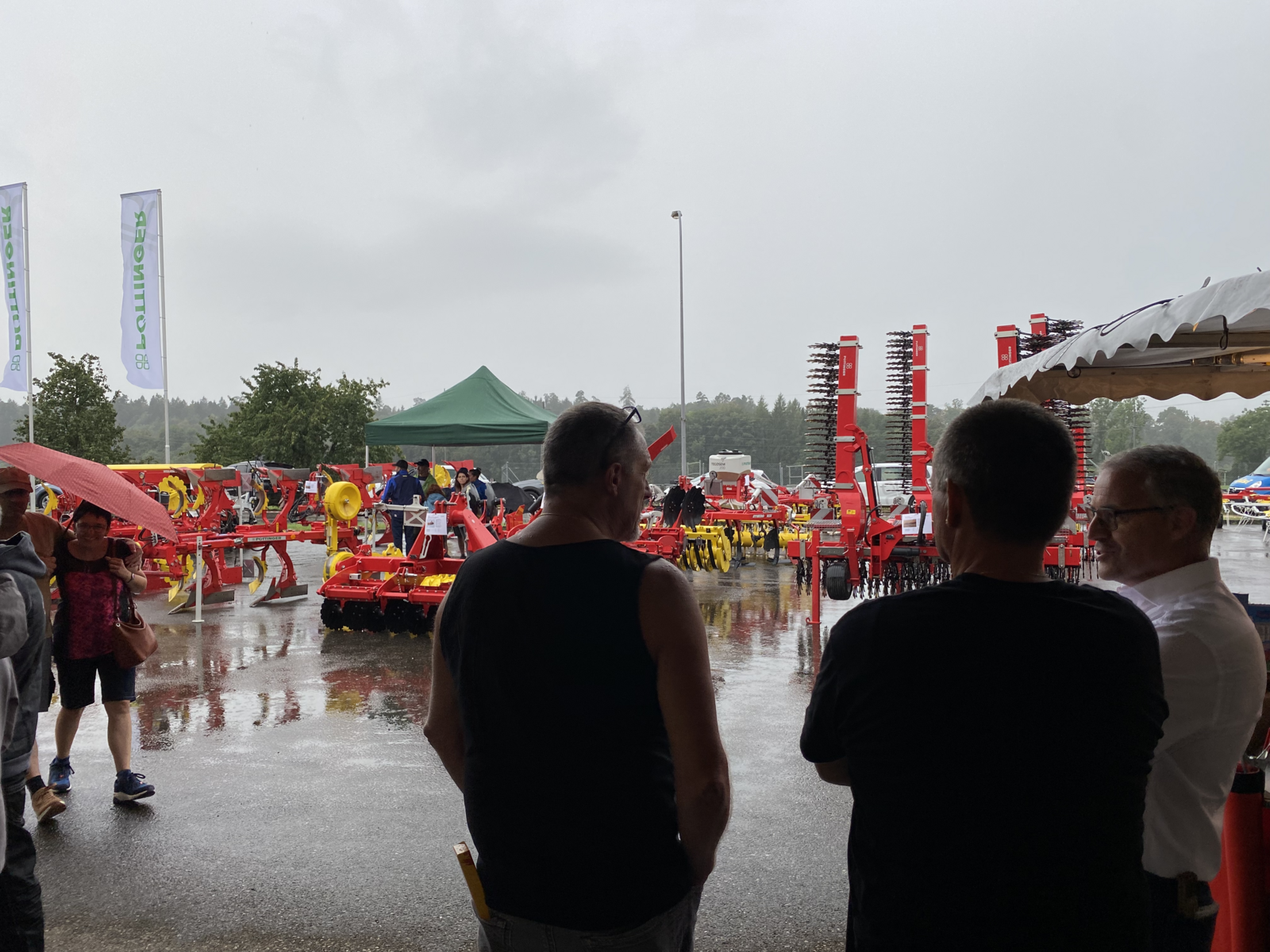 Der guten Stimmung verpasste der Regenguss aber keinen Dämpfer, vielmehr bot sich so eine gute Gelegenheit, um beim Zmittag den persönlichen Austausch zu pflegen. Von ein paar Regentropfen lies sich auch das gut aufgestellte Pöttinger-Team nicht aus der Ruhe bringen. Geschäftsführer Hanspeter Hitz nahm die Sache gelassen: «Was man nicht ändern kann, darüber braucht man sich auch nicht aufzuregen. Wir freuen uns über die vielen Gäste und und über das Interesse an unseren Maschinen.»