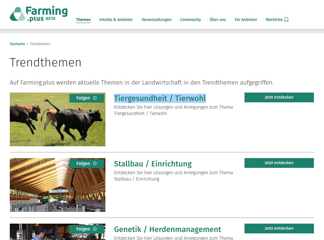 Die Website (www.farming.plus) ist nach den folgenden 13 Themenbereichen geordnet: