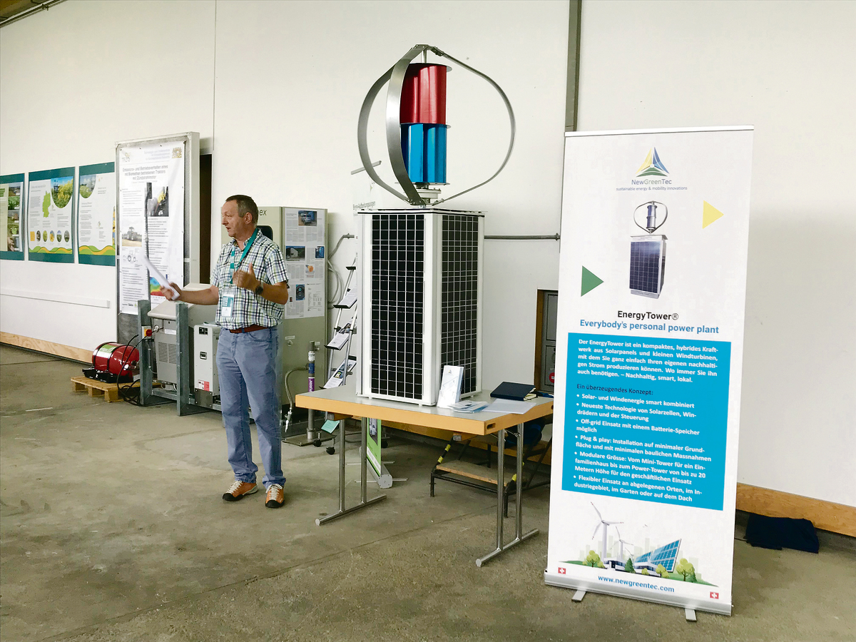 Der Energy-Tower, den Hans Rüdlinger von der Firma New-Green-Tec präsentierte, ist eine Kombination aus Solar- und Windenergie. "In China sind solche Kombikraftwerke vielerorts zu sehen, in Europa hingegen kennt man sie noch kaum", sagte Rüdlinger. Ihre Vorteile lägen darin, dass sie geräuschlos funktionieren, keinen Vogelschlag verursachen und modular zusammengesetzt werden können. Es gibt auch eine mobile Variante, die man auf einen Anhänger laden und beispielsweise mit auf die Alp nehmen kann, um dort eine unabhängige Stromversorgung zu ermöglichen.