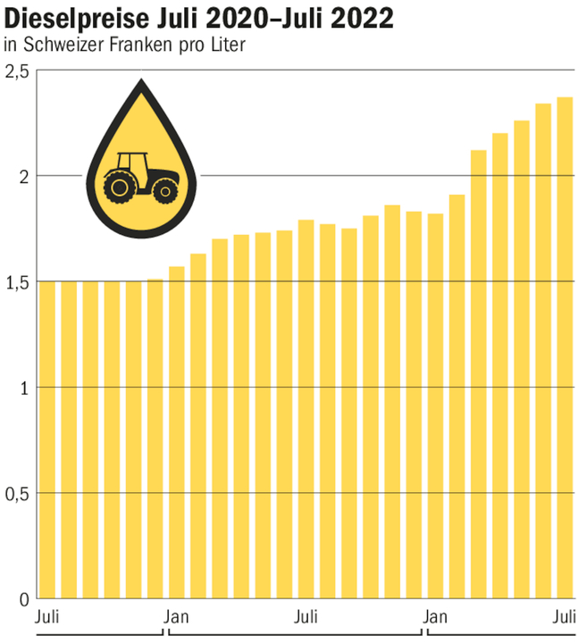 Im Juli 2020 kostete ein Liter Diesel in der Schweiz im Schnitt 1.50 Franken. Im Juli 2022 waren es stolze 2.37 Franken. Für die Bauern, für die auch andere Kosten in den letzten Monaten stark gestiegen sind, ist das schmerzhaft. [IMG 2] Lieferant mit Rabatten «Die Preisanstiege bei den Treibstoffen beschäftigen unsere Mitglieder stark», sagt Anton Moser, Präsident des Luzerner Verbandes für Landtechnik und des…