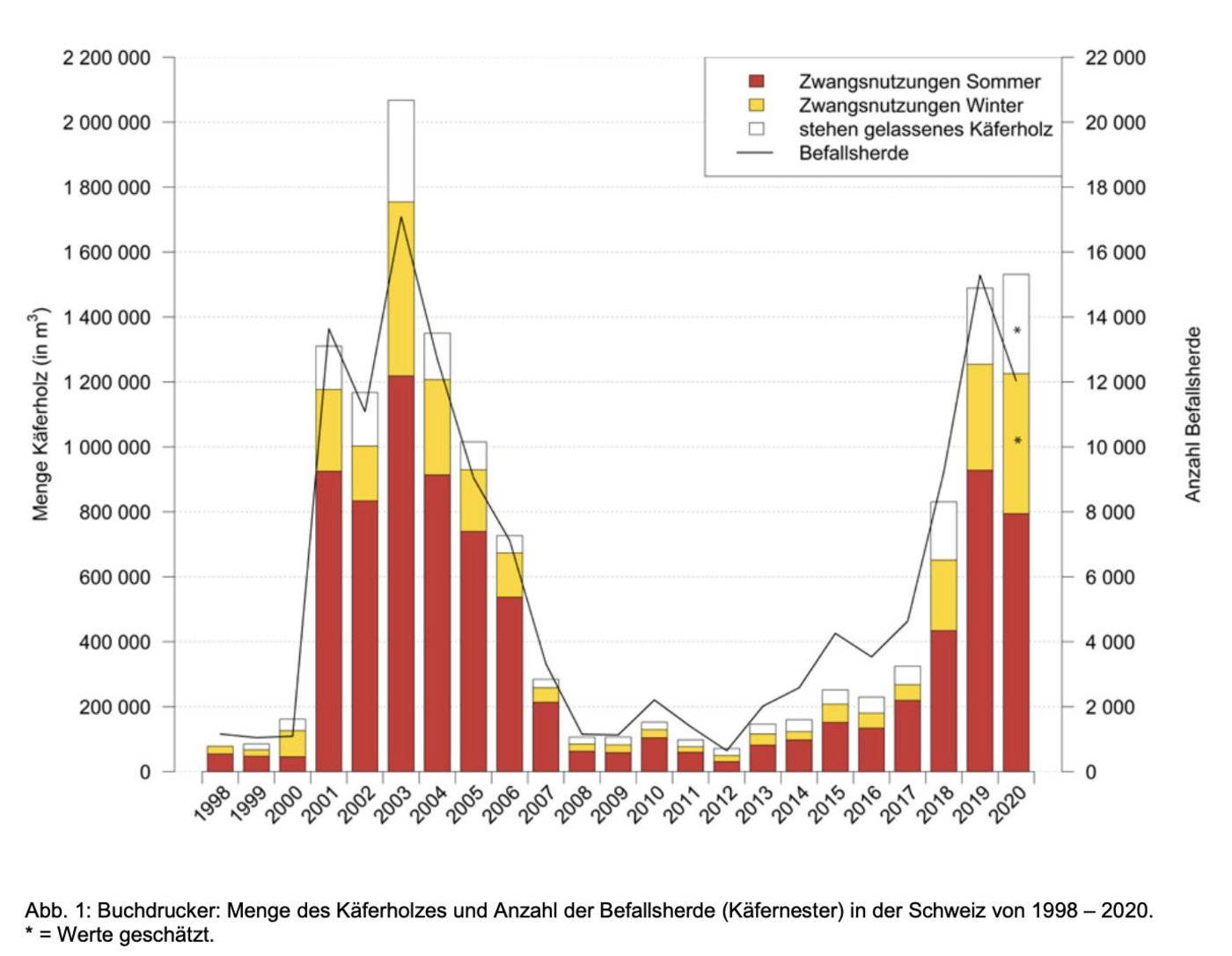 Ausserdem wurden 2020 mit durchschnittlich 29'000 Käfer pro Falle die höchsten Werte seit Beginn der Aufzeichnungen 1984 erreicht. Aufgrund der Daten vermutet man, dass die Befallsherde in der Fläche zunehmen. Nicht geräumte Herde könnten sich rasch ausdehnen.