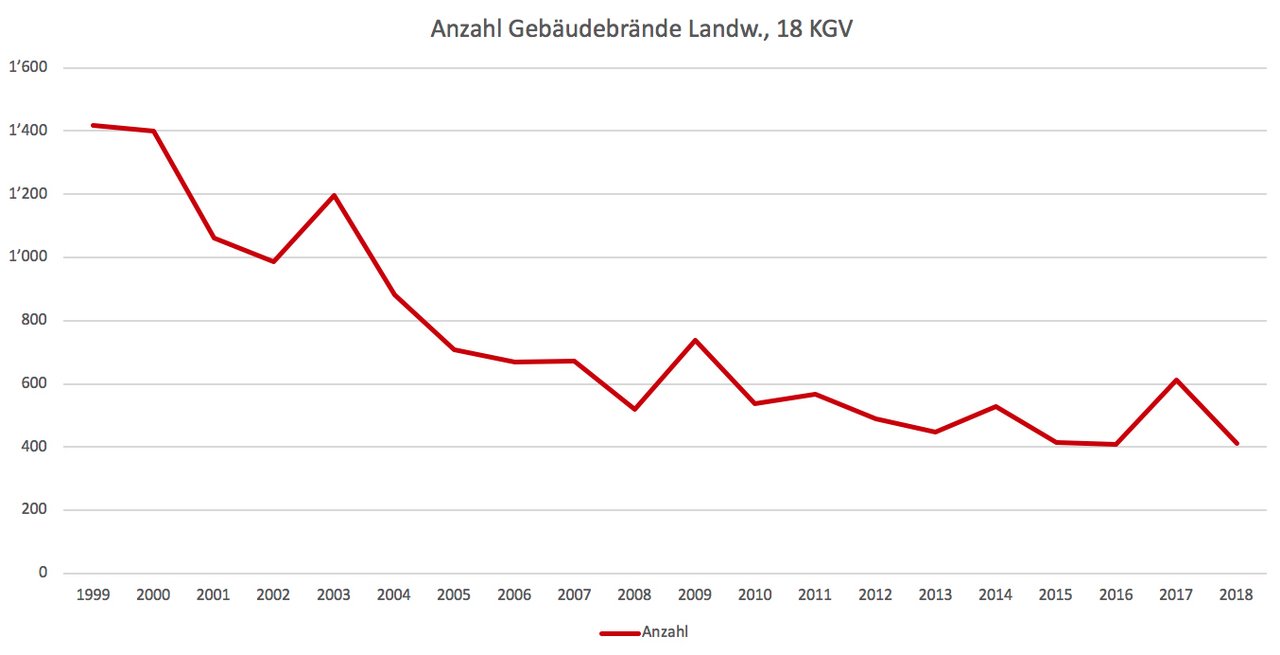 In Stein (Appenzell Ausserrhoden) brennt ein Stall lichterloh. Die Flammen züngeln durch das verbrannte Dach, ein dunkler Rauch steigt in den blauen Himmel hoch. (Wir berichten) Fast wöchentlich erscheint ein Artikel mit einem ähnlichen Bild auf unserer Webseite. 412 Brände gab es 2018 in der Landwirtschaft, wie aus einer Auswertung der Vereinigung Kantonaler Gebäudeversicherungen (VKG) hervorgeht. Die Brände sind aber rückläufig, wie die Statistik über die 18 Kantone zeigt, welche Mitglied sind bei der Vereinigung. So waren es 1999 noch dreimal so viele Fälle (1’418) *.