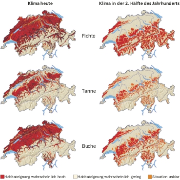 Was sich bereits abzeichnet, wird sich in Zukunft verstärken: Die im Mittelland weit verbreitete Fichte wird aus diesen Lagen bis Ende dieses Jahrhunderts verschwinden. Bei einem mittleren Emissionsszenario gibt es Fichten gemäss WSL nur noch in höheren Lagen der Alpen und Voralpen, im Jura und Tessin. Allerdings gehört dieser Nadelbaum natürlicherweise eher in hohe Lagen; Fichten wurden aus wirtschaftlichen Gründen grossflächig im Mittelland, also ausserhalb ihres Verbreitungsgebiets gepflanzt. So nähert sich der Wald voraussichtlich einem natürlicheren Verhältnis von Nadel- und Laubbäumen an. Auch der empfohlene Fichtenanteil wird je nach Szenario von heute 22 auf 17 oder sogar neun Prozent korrigiert werden, wie es im Merkblatt «Zukunft der Fichte im Mittelland» heisst.