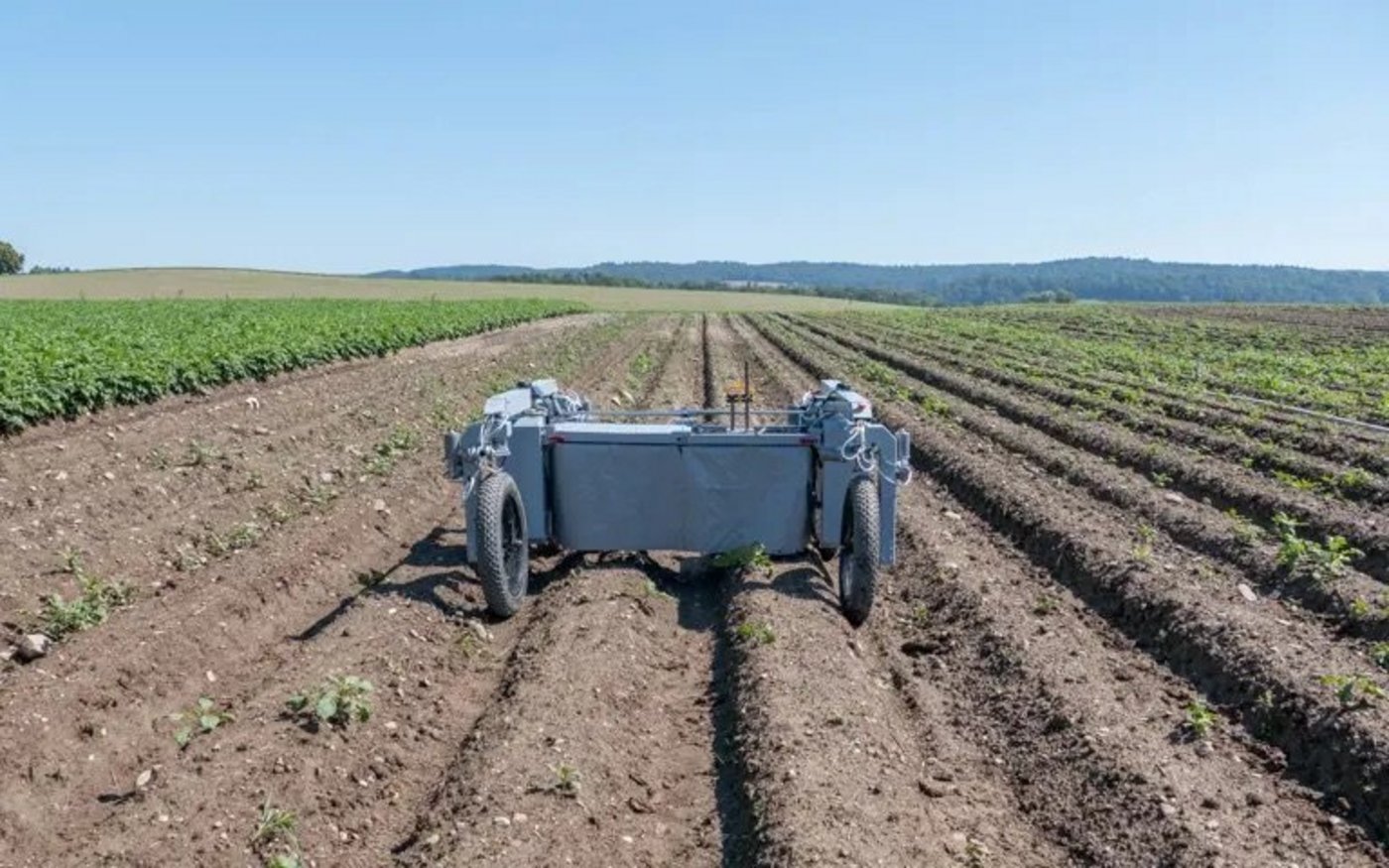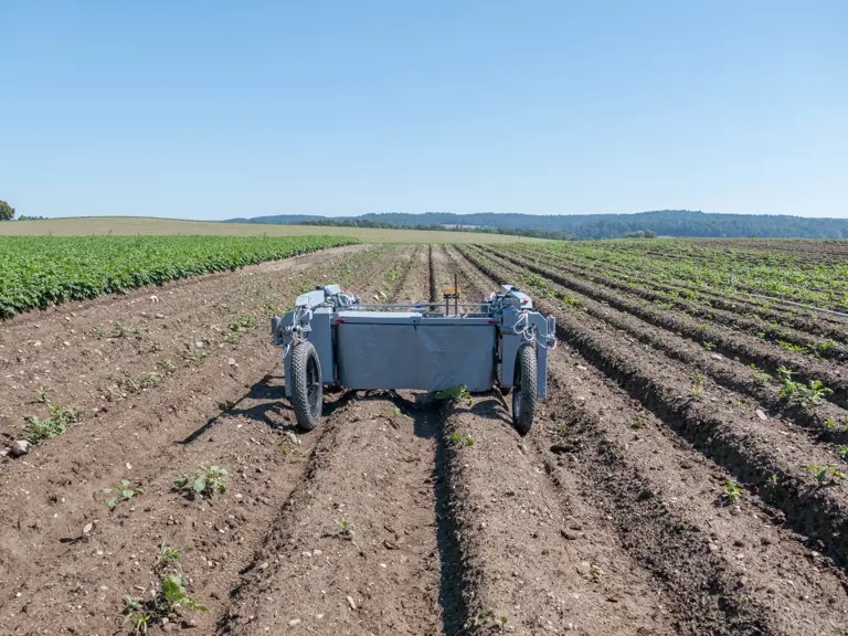 Bei einer Testfahrt im Sommer auf einem Karottenfeld in der Nähe des Flughafens Zürich ist der aktuellste Prototyp von Caterra noch langsam unterwegs. «Es geht in dieser Phase vor allem darum, die Software so weit zu bringen, dass die Kameras die gekeimten Karotten zuverlässig vom Unkraut unterscheiden können», erklärt Neff.