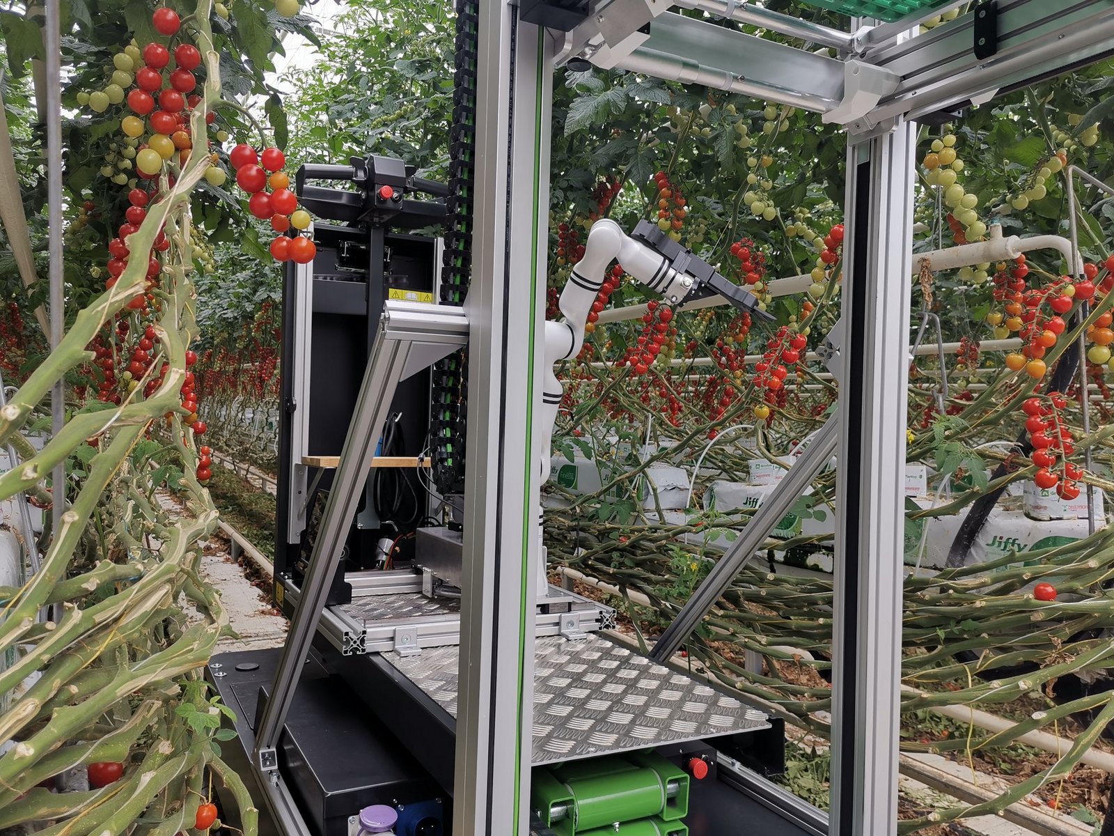 Im letzten Jahr liess der Maschineningenieur einen ersten Prototypen mit einem Roboterarm in zwei Gewächshäusern nach Cherry-Tomaten greifen. Der Roboter bestand primär aus Kameras zur Erkennung der Tomatenrispen, der Software und einem Roboterarm. Technisch funktionierten das Ernten und Entlauben bereits ziemlich gut, doch es fehlte noch an der Präzision und an Geschwindigkeit.