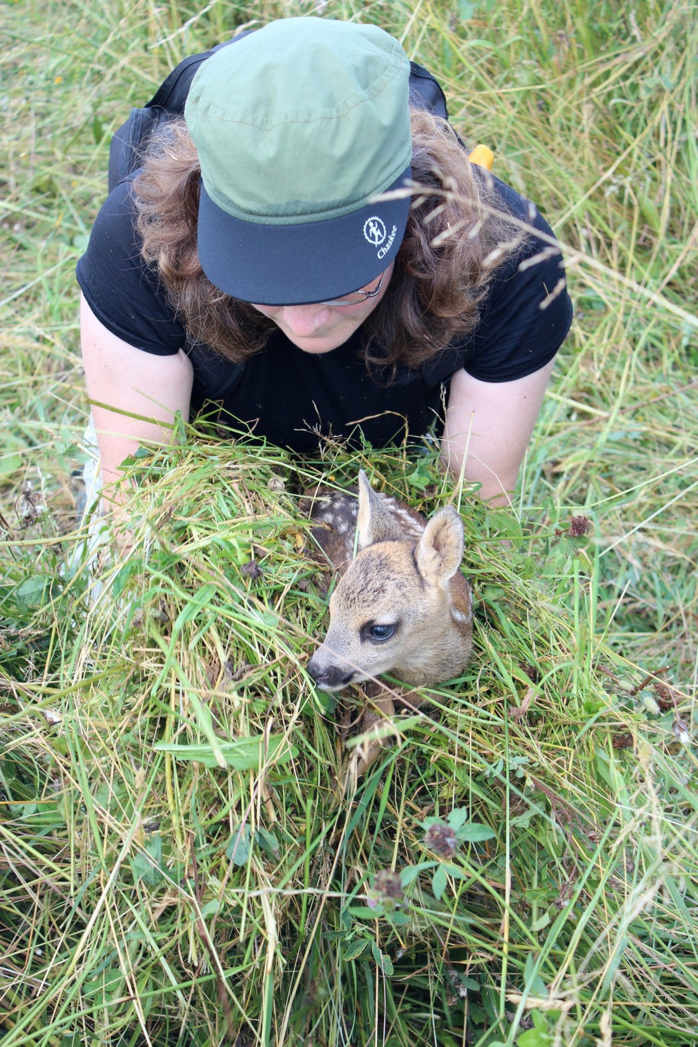Wegtragen: Kitz in einer Holzkiste an den Waldrand tragen und im Schutz einiger Büsche abstellen. Nach der Mahd wieder freilassen.