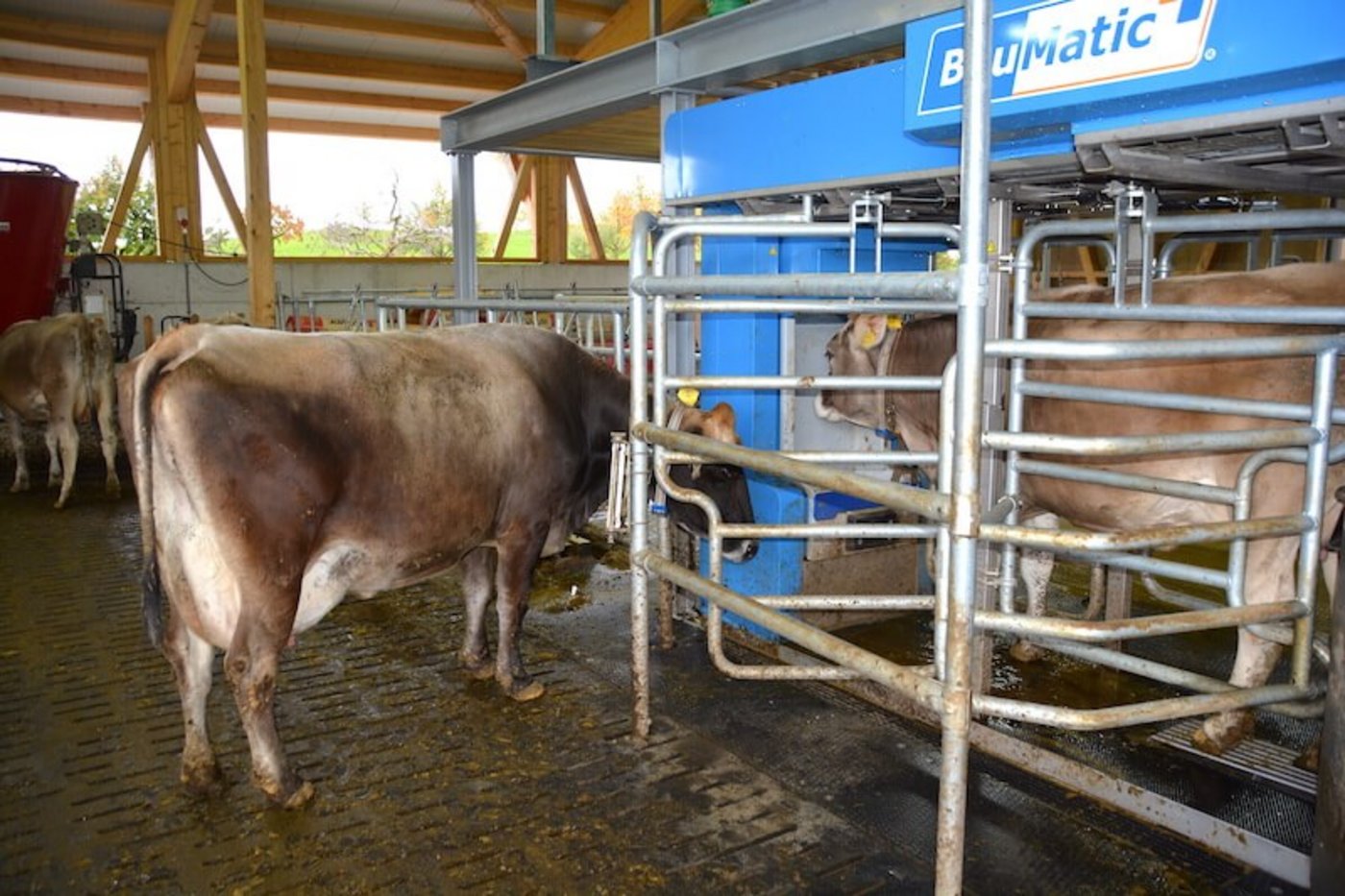 Im Boumatic-Melkroboter wird die Kuh durch die Hinterbeine gemolken, was an Side-by-Side-Melkstände erinnert.