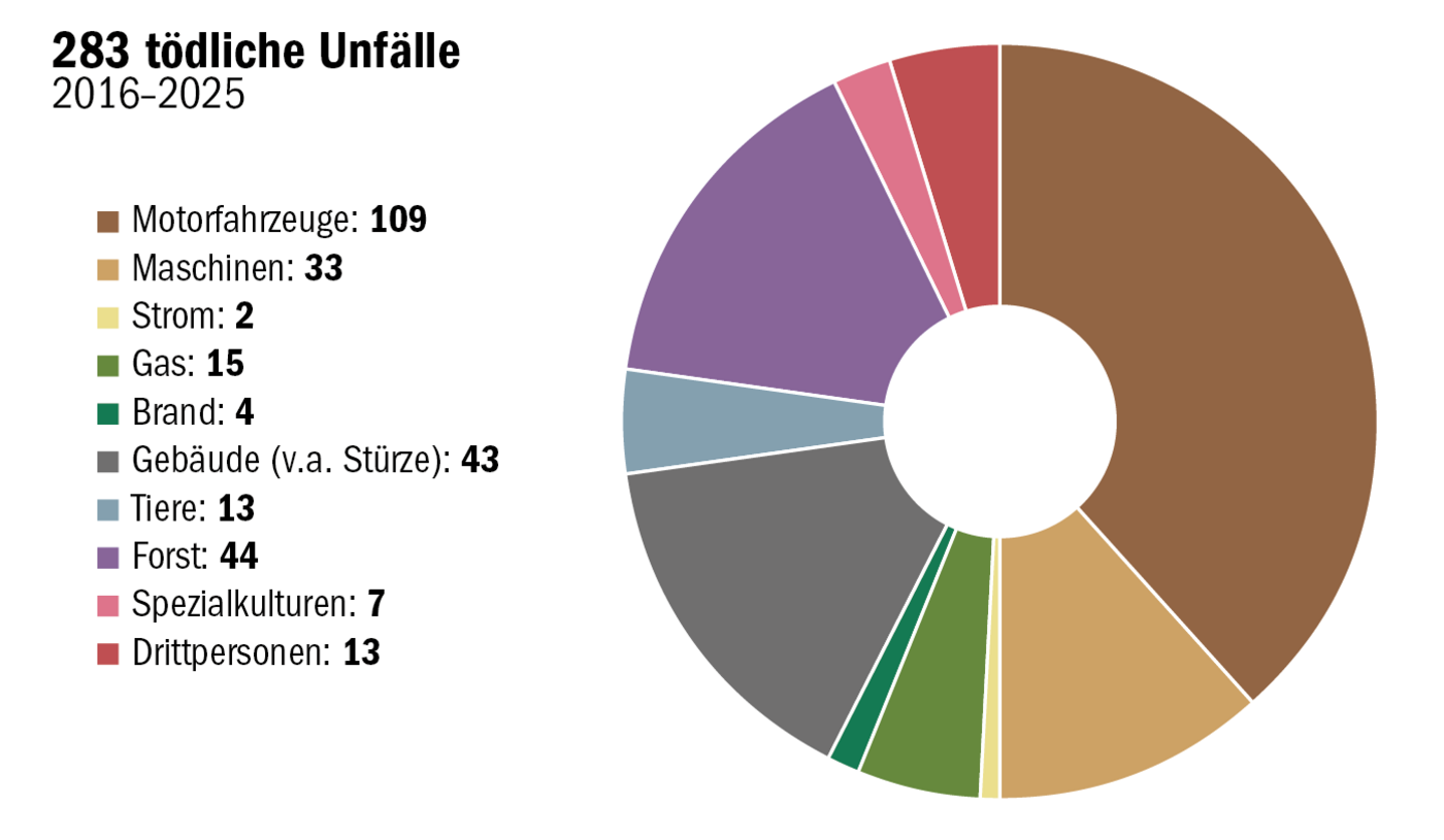 Doch 22 Tote in einem Jahr, das sind immer noch fast zwei pro Monat. Und bei den Maschinenunfällen ist kaum Entspannung in Sicht. Auffällig beim Blick auf die Motorfahrzeugunfälle: Tödliche Stürze mit landwirtschaftlichen Motorfahrzeugen sind über die Jahrzehnte massiv zurückgegangen. Wurden in den 1970er und den 1980er Jahren noch regelmässig über 20 Personen pro Jahr durch Fahrzeugsturz getötet, waren es 2025 nur noch zwei. Hier haben Sicherheitskabinen und Gurttragepflicht viel bewirkt.