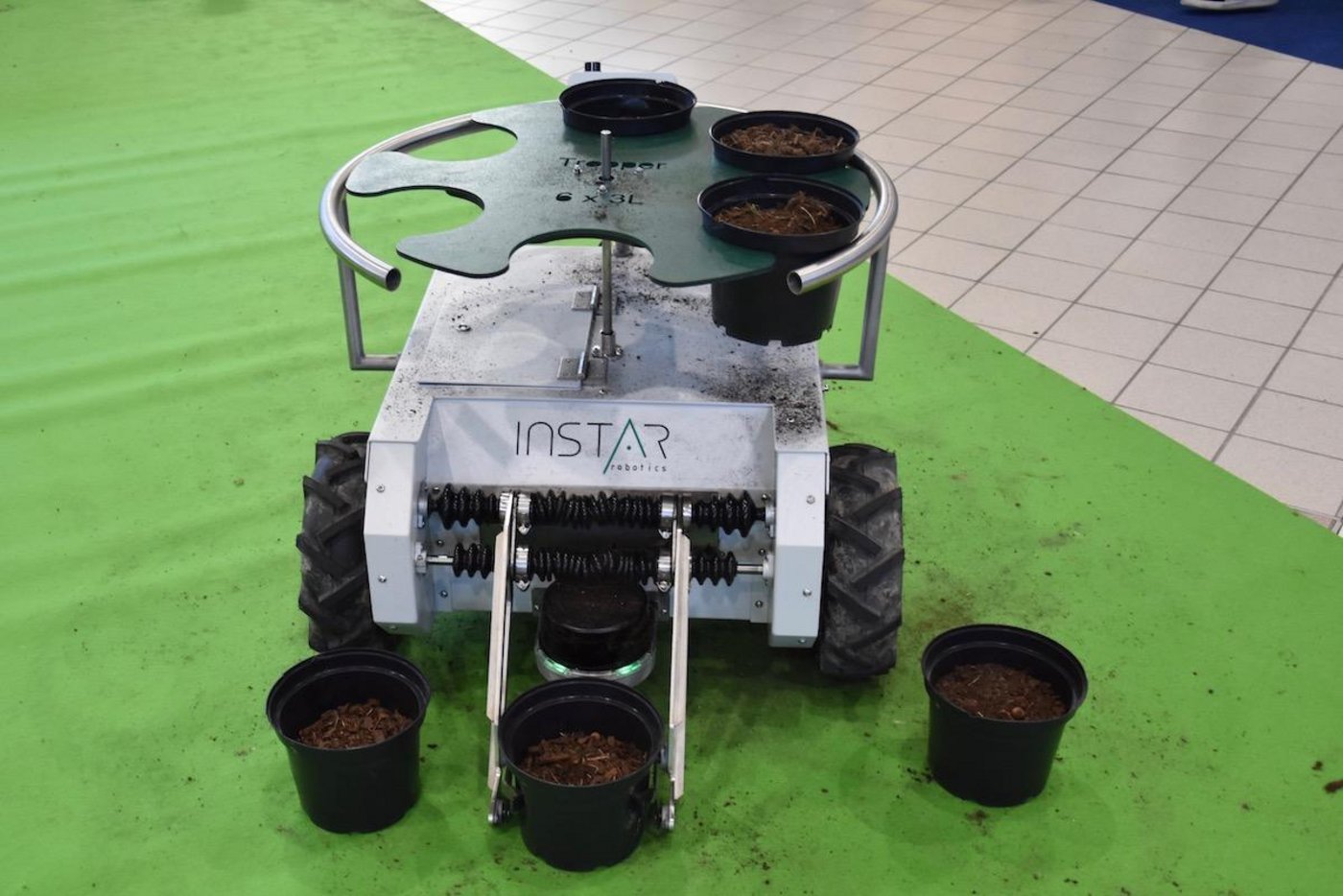 Der Trooper des französischen Start-ups InstarRobotics hat die Aufgabe, Töpfe zu verschieben, beispielsweise wenn die Pflanzen wachsen und mehr Platz brauchen. So sollen für die Pflanzen optimale Bedingungen geschaffen werden und das aufwändige, manuelle Verschieben erübrigt sich. Das Roböterli lädt mit seinen Greifarmen pro Fahrt bis zu sechs Töpfe auf und stellt sie am gewünschten Ort wieder ab. Laut den Herstellern verschiebt er in einer Stunde250 Töpfe. Ausgestattet mit einem Sensor, Navigationssystem und Lithium-Batterie soll er ganz autonom 24 Stunden am Tag arbeiten können. Nach zehn Stunden muss der Akku gewechselt werden.