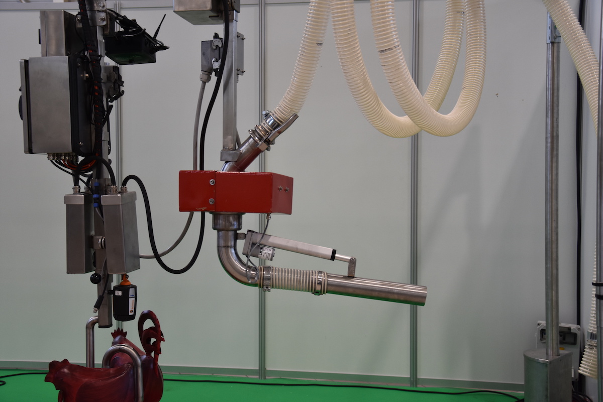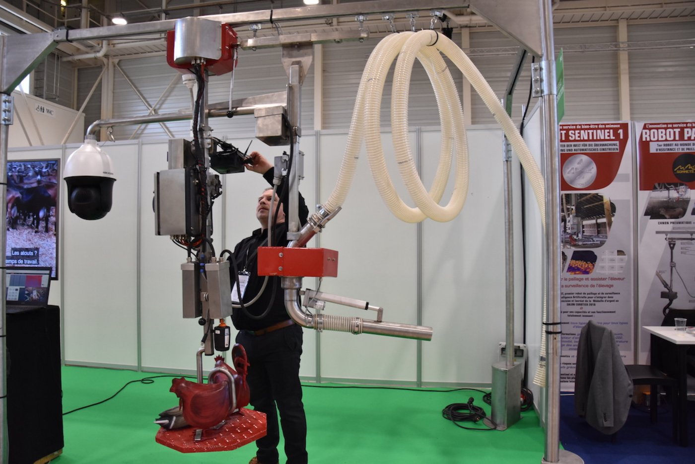Die französische Gesellschaft Dussau Distribution stellt an der Fira ihren autonomen Einstreuroboter Sentinel 2 vor. Er misst verschiedene Parameter, wie Ammoniak, CO2, Temperatur oder Feuchtigkeit und schätzt so ein, wo eingestreut werden muss. Mit einer pneumatischen Strohkanone schiesst er dann die Streu an die richtige Stelle. Vorbereitet wird die Streu in einer Aufbereitungsmaschine, die in verschiedenen Ausführungen verkauft wird und diverse Arten von Streu herstellen, mischen und zerkleinern kann. So kann die optimale Streu für jede Nutztierarten hergestellt und ausgebracht werden.